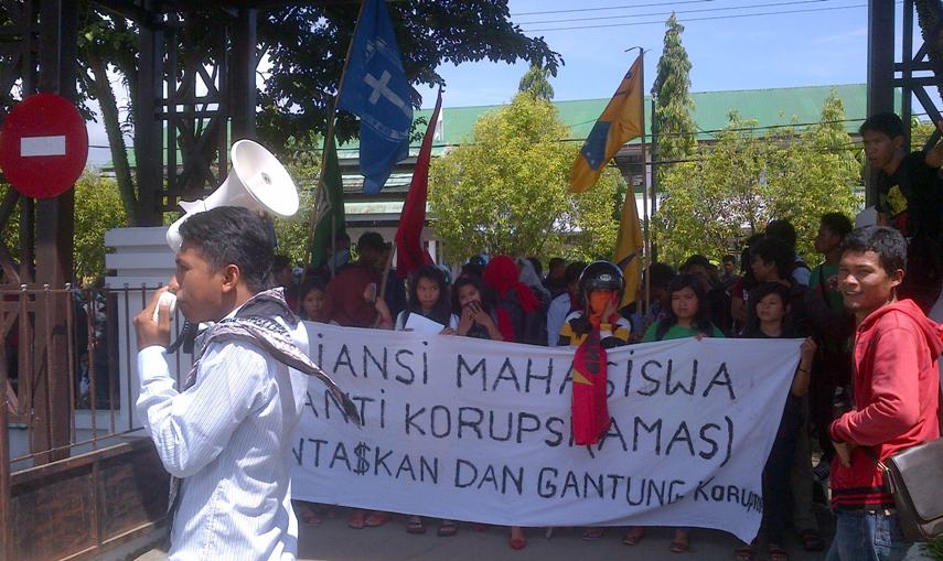 “Tuntaskan kasus korupsi dana alokasi khusus dan dugaan penyalahgunaan anggaran percepatan pembangunan infrastruktur pendidikan tahun 2010, dan proyek pembangunan jaringan air bersih bambalu,” teriak mahasiswa saat melakukan orasi.