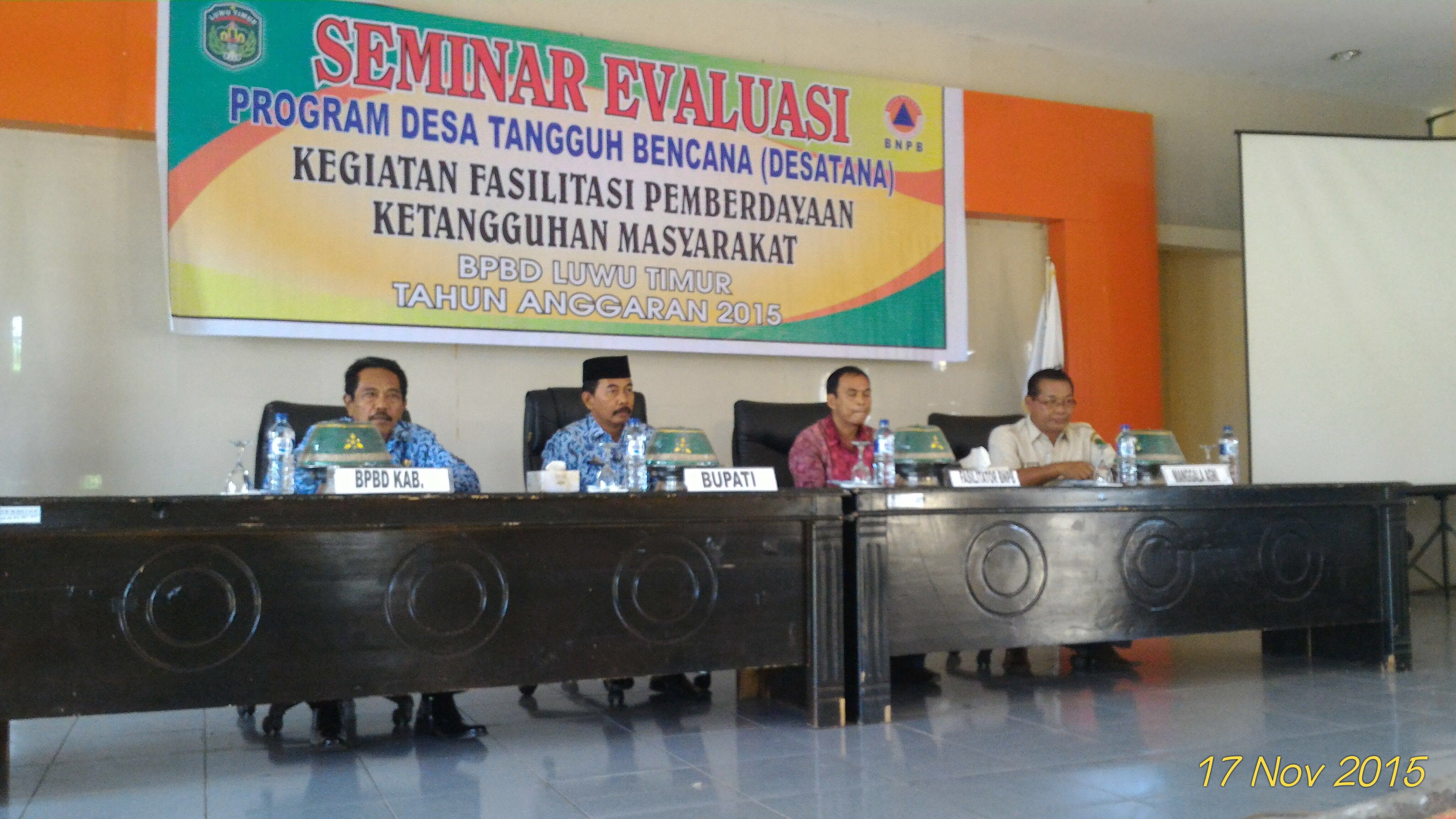 Badan Penanggulangan Bencana Daerah (BPBD) Kabupaten Luwu Timur melakukan monitoring dan seminar evaluasi program Desa Tangguh Bencana (Destana) yang difokuskan pada dua desa yakni Desa Pongkeru Kecamatan Malili dan Desa Kasintuwu Kecamatan Mangkutana.