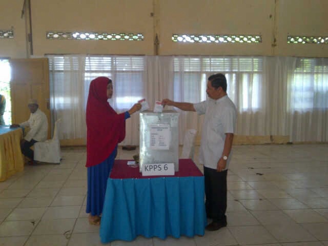 Calon Bupati Luwu Timur nomor urut 1 yakni Nur Husain melakukan pencoblosan di Tempat Pemungutan Suara (TPS) 02 kelurahan Malili, Kecamatan Malili, Rabu (9/12/15) pagi ini.