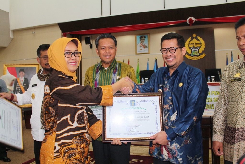 Penghargaan diserahkan Prof Enny Nurbaningsih selaku Kepala Badan Pembinaan Hukum Nasional, Kemenkum HAM RI di Ruang Pola Kantor Gubernur Provinsi Sulawesi Selatan, Jumat (18/12/15).
