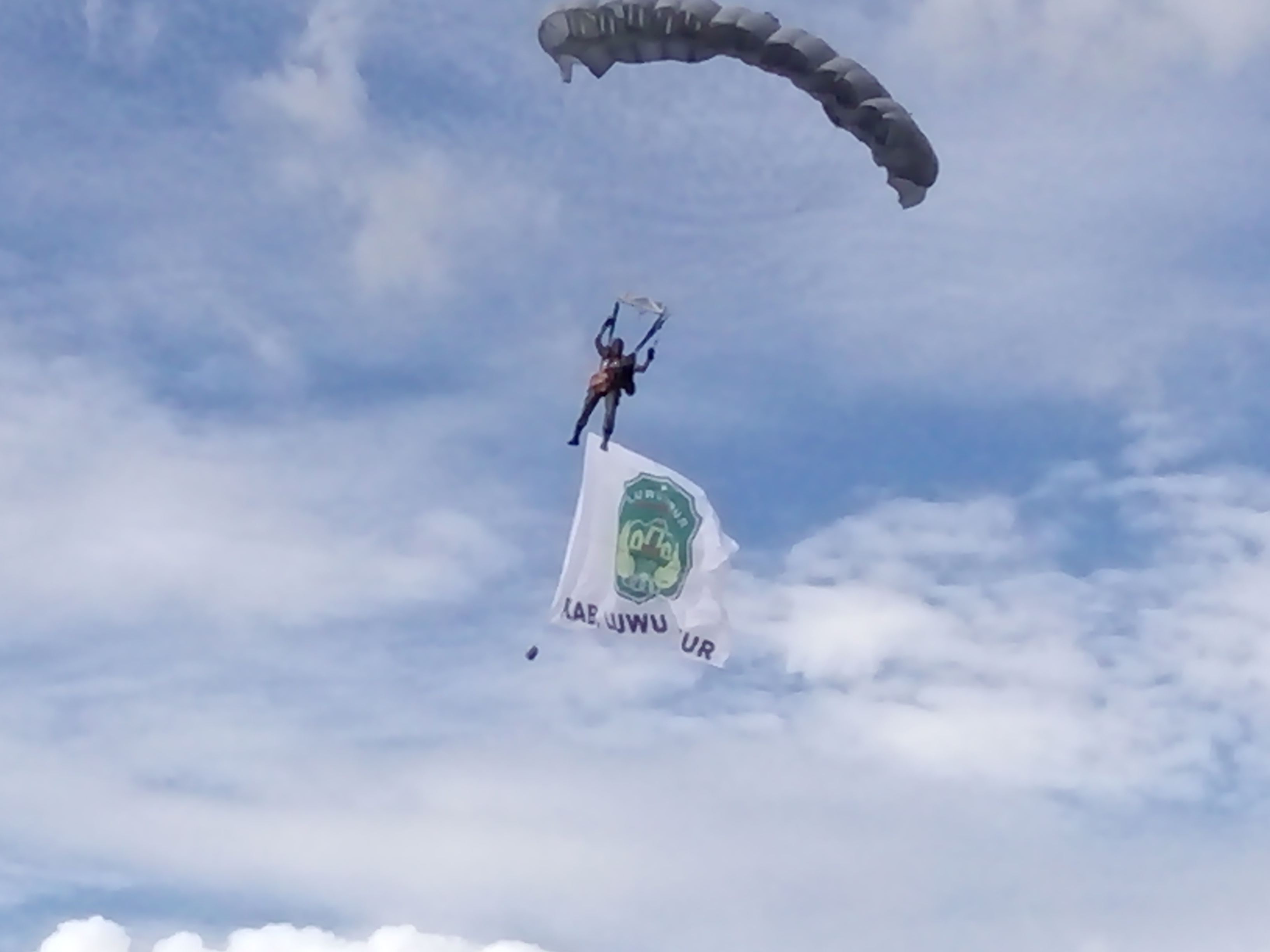 Selain itu, bendera Merah Putih dan bendera berlogo Provinsi Sulawesi Selatan juga dikibarkan oleh penerjun.