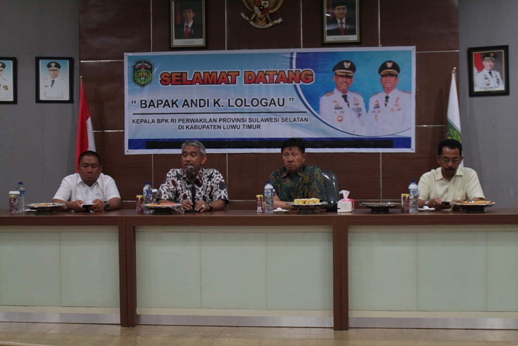 Kepala Perwakilan Badan Pemeriksa Keuangan (BPK) RI Sulawesi Selatan, Andi K Lologau melakukan kunjungan kerja di Kabupaten Luwu Timur. Kedatangan Kepala Perwakilan BPK RI ini disambut Bupati Luwu Timur, HM Thorig Husler di Aula Rumah Dinas Bupati, Rabu malam (11/05/16).