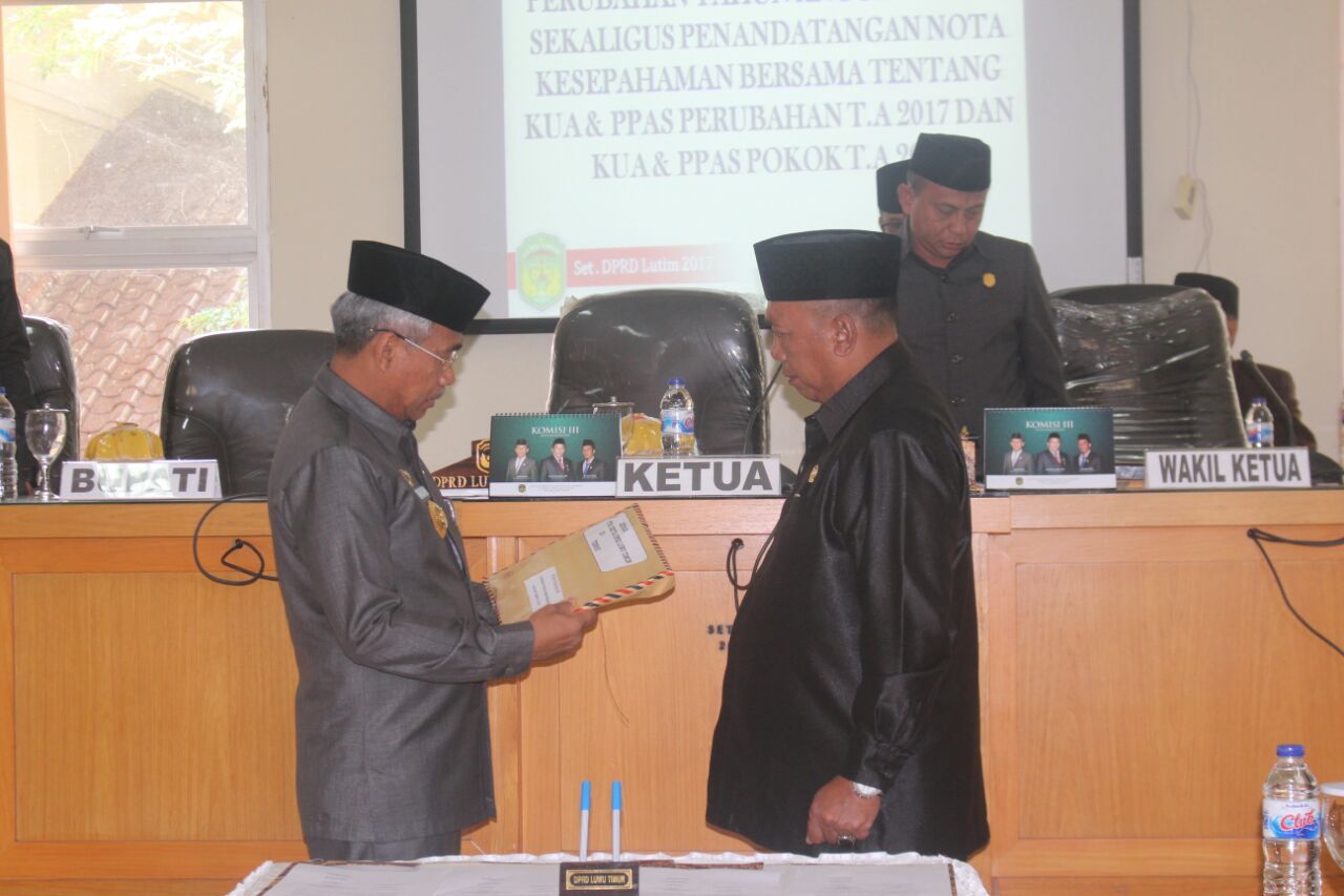 Bupati Luwu Timur HM Thorig Husler menyerahkan penetapan rancangan peraturan daerah tentang APBD Perubahan T.A 2017 dan APBD Pokok T.A 2018 kepada DPRD Kabupaten Luwu Timur saat berlangsungnya sidang Paripurna di Gedung DPRD, Senin (23/10/2017).