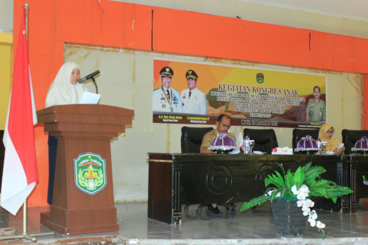 Dinas Sosial, Pemberdayaan Perempuan dan Perlindungan Anak (Dinsos P3A) Kabupaten Luwu Timur melaksanakan Kongres Anak (Pertemuan Forum Anak) Tingkat Kabupaten Luwu Timur di Gedung Wanita Simpurusiang, Puncak Indah Malili, Senin (11/12/2017).