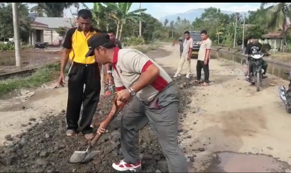 Warga bersama polisi dari Polsek Bupon, bahu membahu menghamparkan material tanah dan batu kecil di badan jalan yang berlubang. Hanya menggunakan cangkul dan sekop, lubang di jalan desa ditutupi, supaya kendaraan yang melintas, tidak terjebak dalam kubangan.