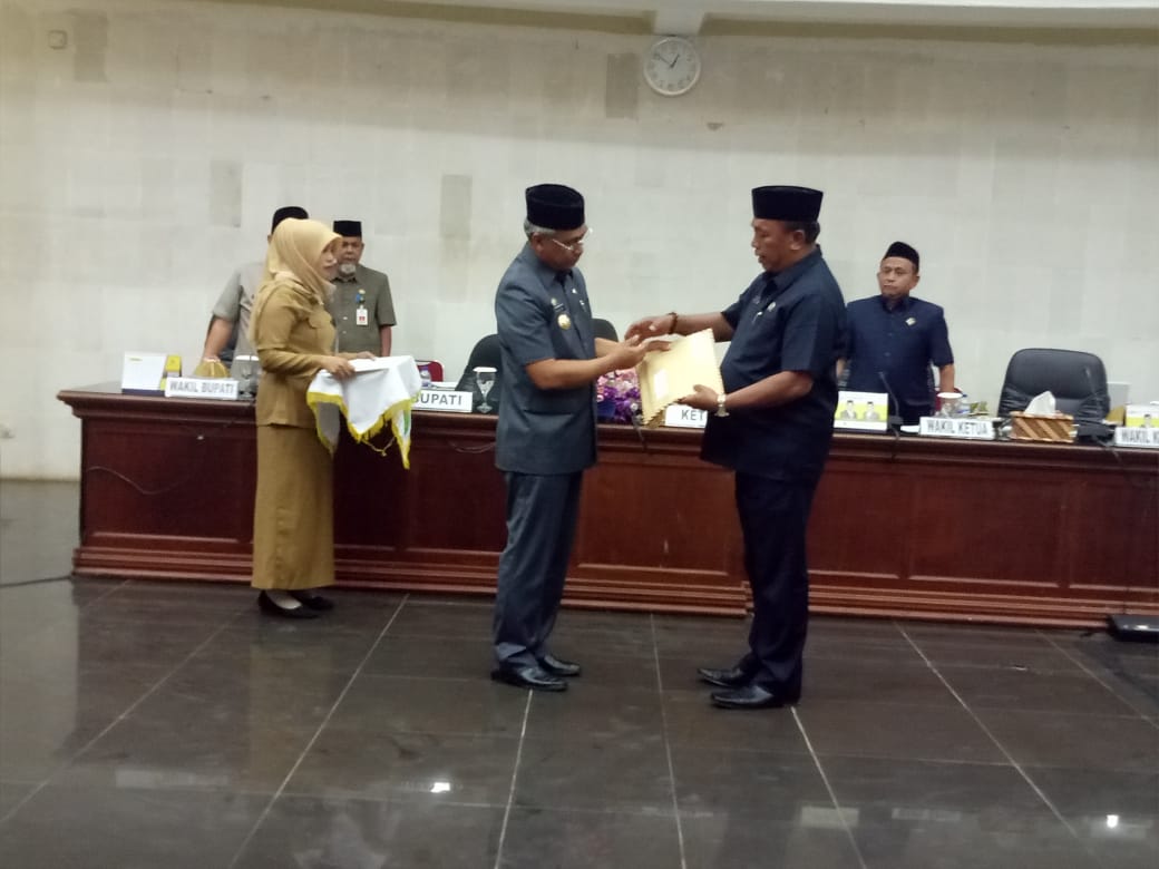 Bupati Luwu Timur, HM. Thorig Husler, menyerahkan Draf Ranperda Tentang Rancangan Anggaran Pendapatan dan Belanja Daerah (RAPD) Pokok Tahun 2019 ke Dewan Perwakilan Rakyat Daerah (DPRD) Kabupaten Luwu Timur, Senin (22/10/2018).