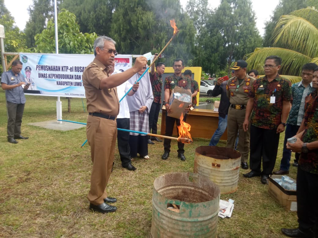 Pemusnahan yang dilaksanakan di depan Kantor Dinas Kependudukan dan Pencatatan Sipil (Disdukcapil) Kabupaten Luwu Timur diawali dengan penandatanganan Berita Acara pemusnahan KTP, dilanjutkan dengan pembakaran KTP yang rusak, bekas dan invalid yang dilakukan langsung oleh Bupati Luwu Timur, HM. Thorig Husler, bersama Ketua DPRD Kabupaten Luwu Timur, H. Amran Syam dan Perwira Penghubung Kabupaten Luwu Timur, Mayor Inf. Suparman, yang disaksikan dari pihak Polres, Bawaslu, KPUD setempat serta Satuan Polisi Pamong Praja.