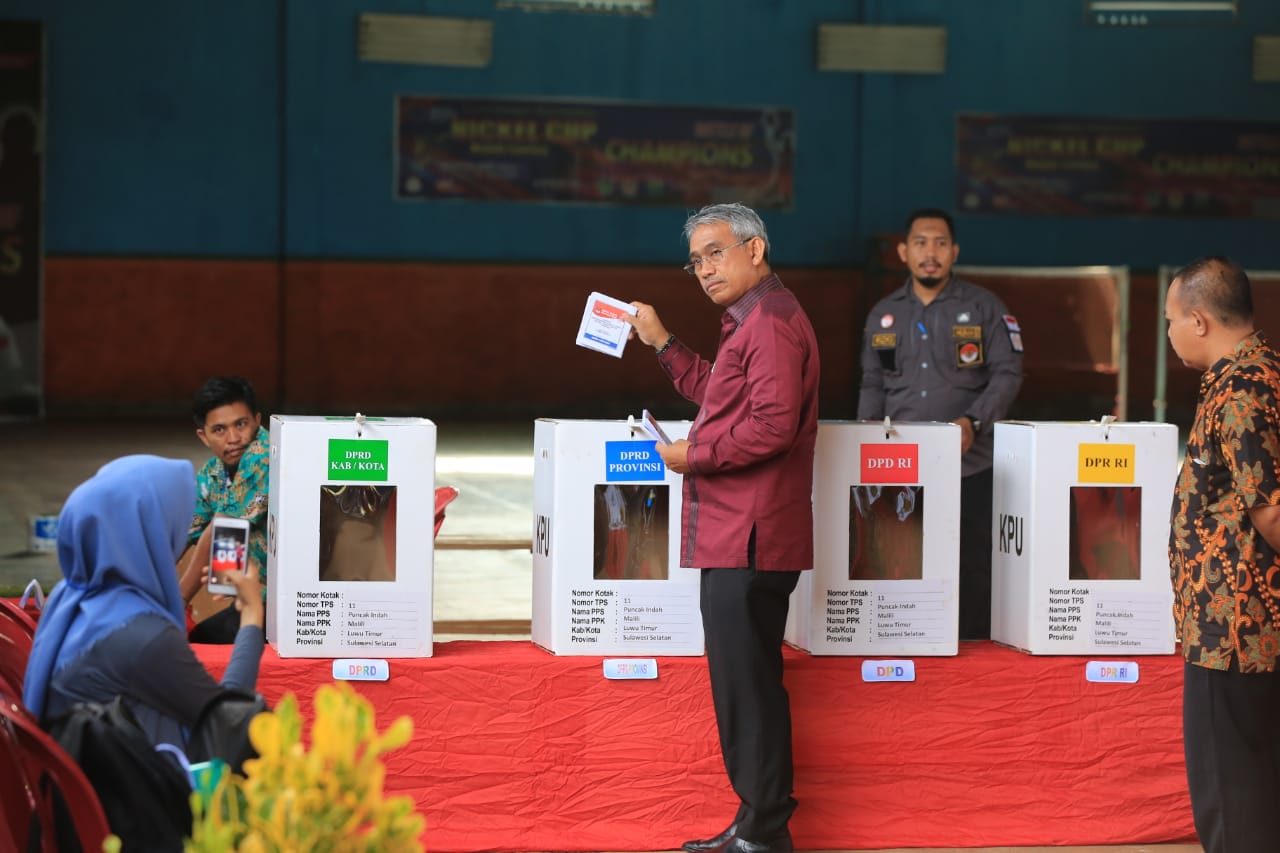 Bupati Luwu Timur, HM. Thorig Husler, didampingi istri, Hj. Puspawati, memberikan suaranya pada Pemilu 2019, hari ini, Rabu (17/04/2019) di TPS 11 Desa Puncak Indah Kecamatan Malili. Tidak hanya Bupati, Wakil Bupati Luwu Timur, Irwan Bachry Syam bersama Istri dr. Ani Nurbani, juga menyalurkan suaranya di TPS 11.