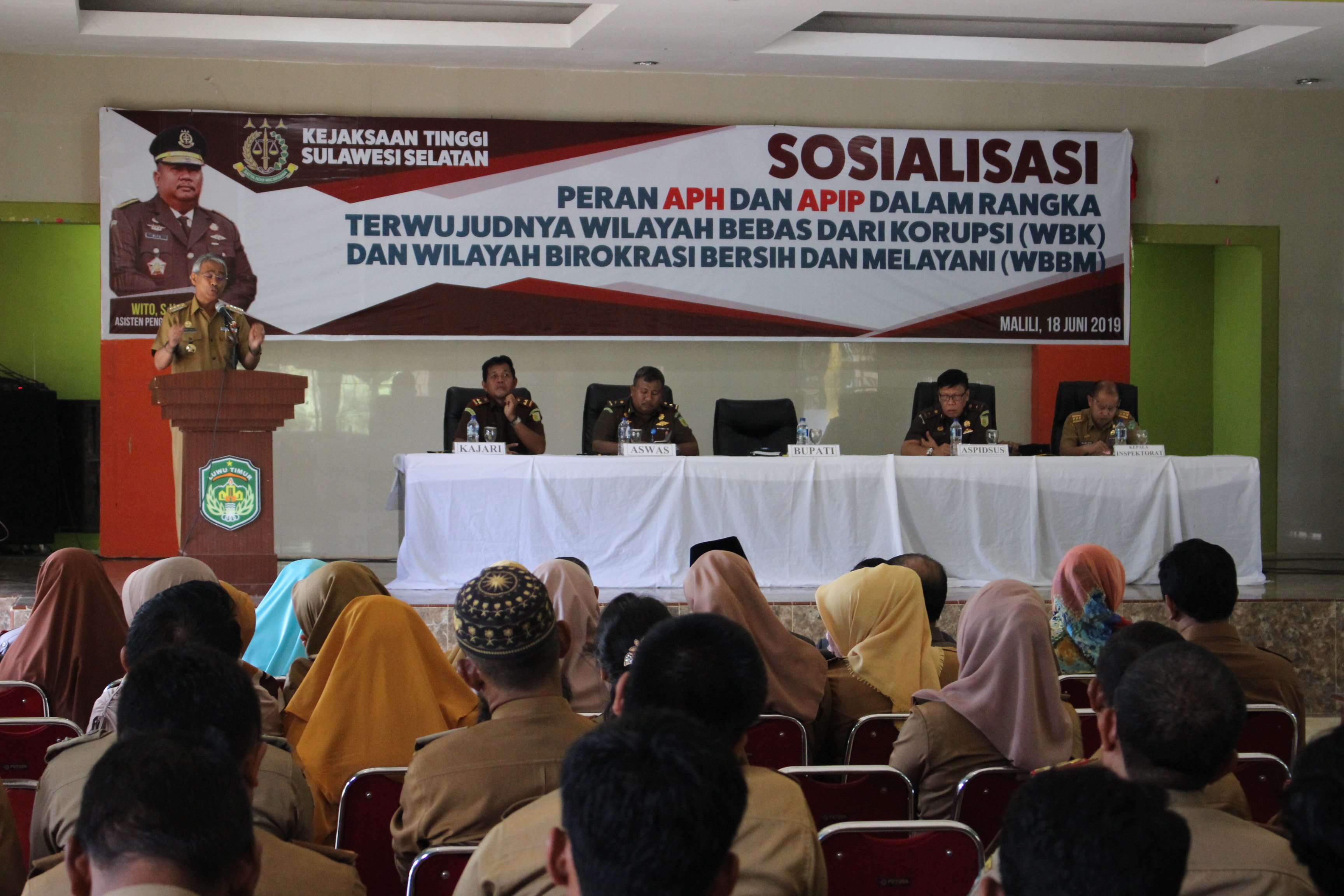 Kejaksaan Tinggi Sulawesi Selatan menggelar Sosialisasi Peran Aparat Penegak Hukum (APH) dan Aparat Pengawasan Intern Pemerintah (APIP) untuk mewujudkan Wilayah Bebas dari Korupsi (WBK) dan wilayah Birokrasi Bersih dan Melayani (WBB) di Kabupaten Luwu Timur, yang berlangsung di Gedung Wanita Simpurusiang Malili, Selasa (18/06/2019).