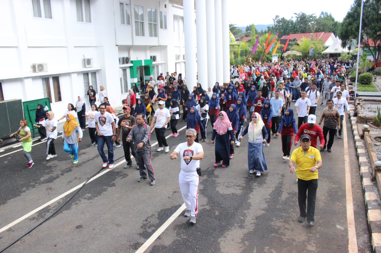 Bupati Luwu Timur, HM. Thorig Husler, bersama ratusan peserta lainnya mengikuti senam massal yang dilaksanakan Kejaksaan Negeri Luwu Timur dalam rangka memperingati Hari Bhakti Adhyaksa (HBA) ke-59 yang jatuh pada tanggal 22 Juli 2019, di halaman kantor Kejaksaan Negeri Luwu Timur, Jumat (19/07/2019).