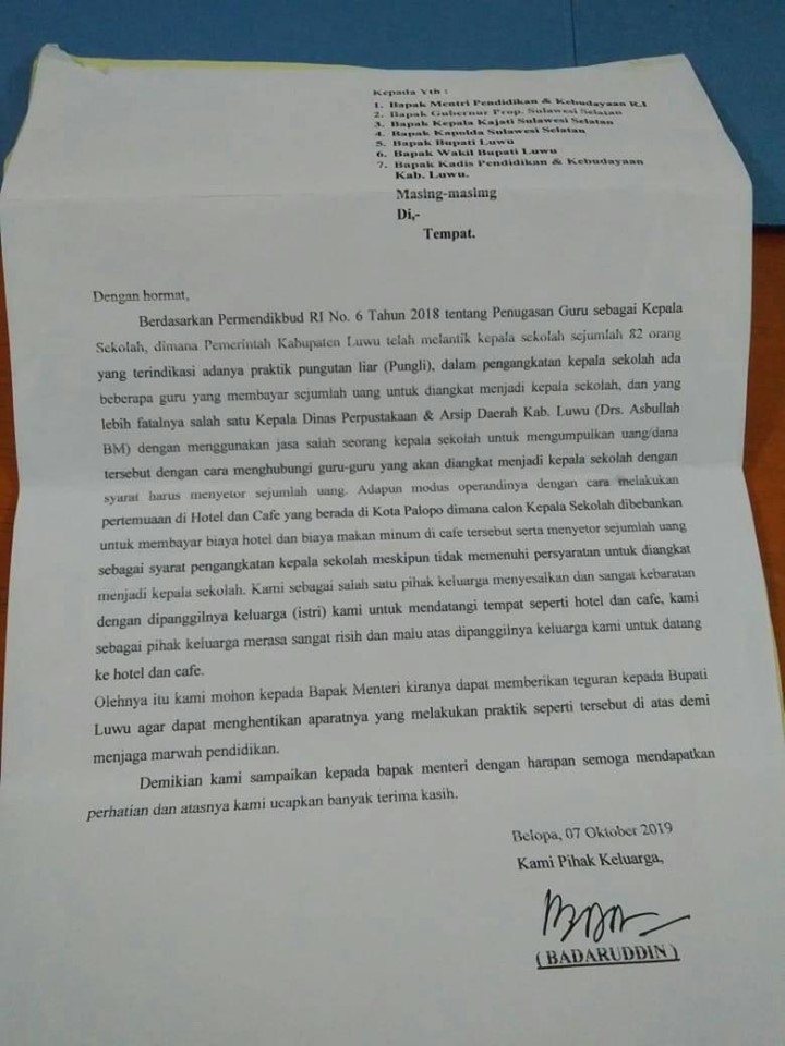 Surat tersebut ditandatangani Badaruddin, warga Luwu yang mengaku istrinya ikut dimintai uang untuk bisa dilantik menjadi kepala sekolah.