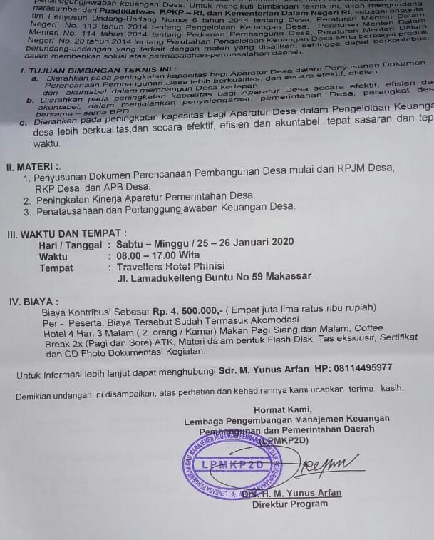 Sementara itu, Direktur Program lembaga pengembangan manajemen keuangan pembangunan dan pemerintahan daerah Drs. HM Yunus Arfan selaku pelaksana kegiatan yang dikonfirmasi soal ini belum memberikan tanggapan, melalui WA yang bersangkutan hanya membaca pesan, namun tidak memberikan jawaban terkait ini.