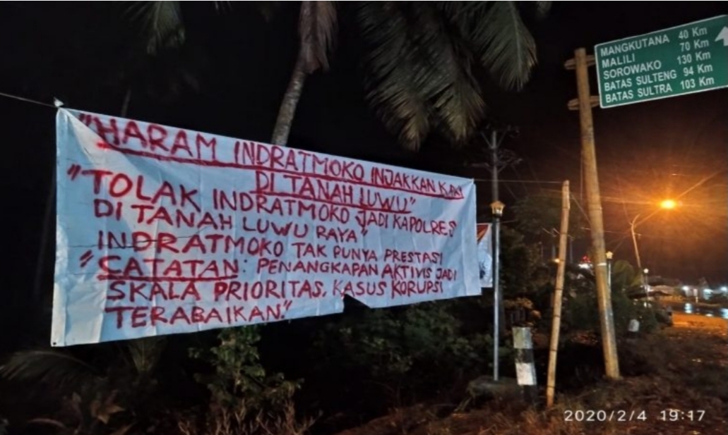 Spanduk tersebut bertuliskan haram Indratmoko injakkan kaki di tanah Luwu, Tolak Indratmoko jadi Kapolres di Tanah Luwu Raya. Indratmoko tak punya prestasi, Catatan: Penangkapan aktivis jadi skala prioritas, kasus korupsi terabaikan.