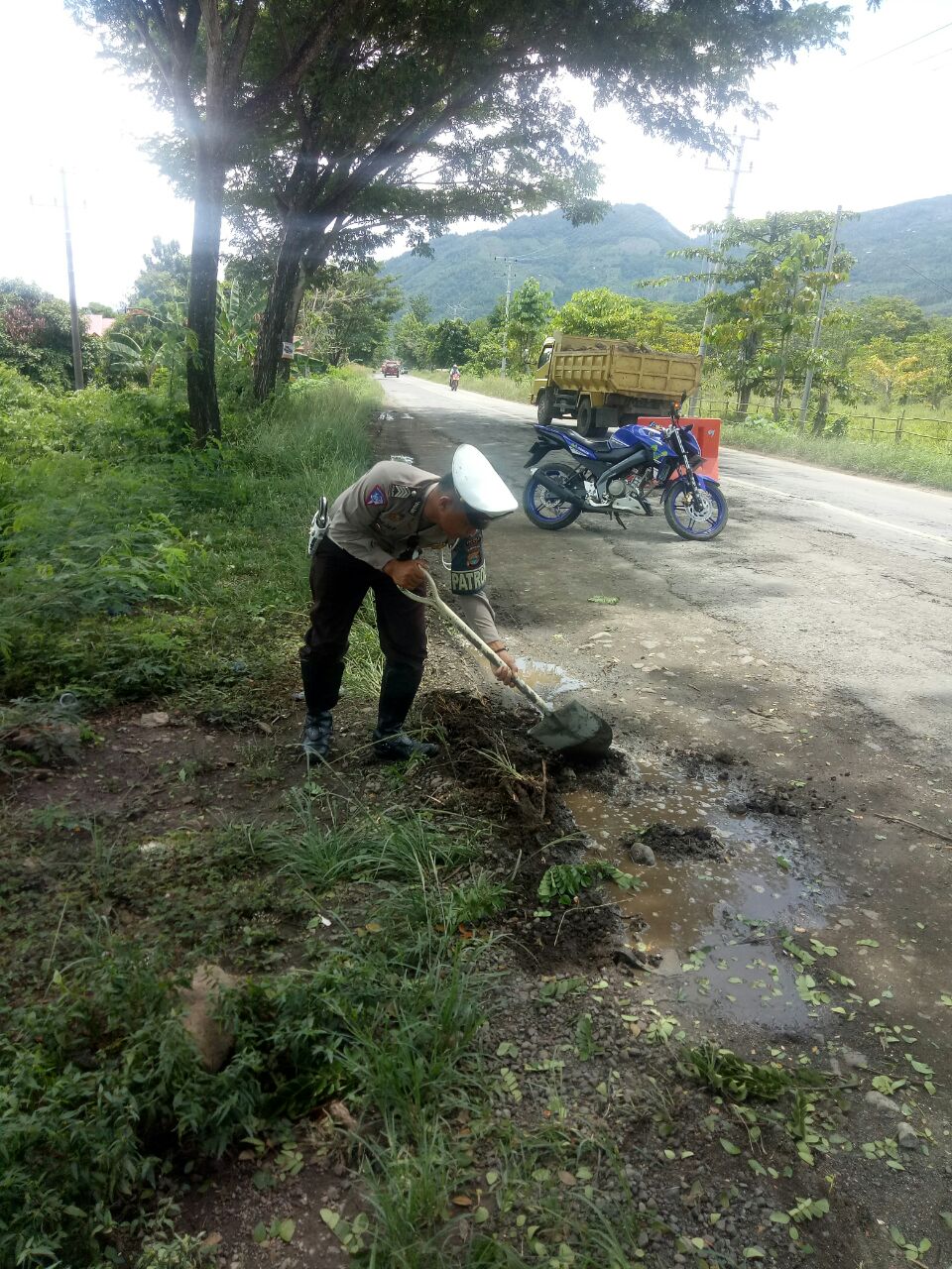 LUWU – Satuan Lalulintas Polres Luwu, Personil Polsek Bua, bersama masyarakat di Desa Karang-Karangan, bergotongroyong, menambal jalan Trans Sulawesi, poros Bua-Belopa. Di lokasi ini, sering terjadi kecelakaan lalulintas, akibat jalan berlubang.