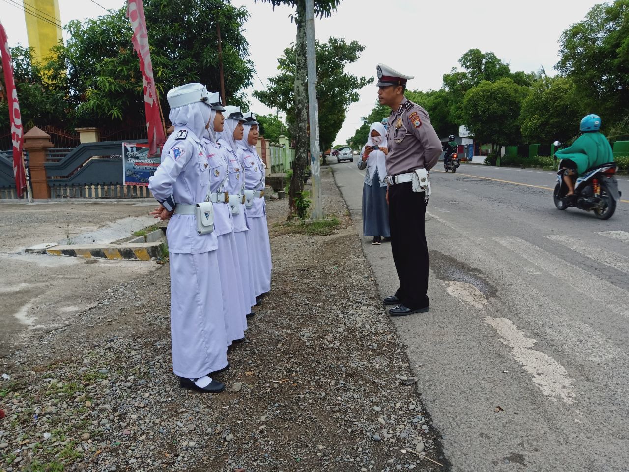 Nampak Aipda Tenriharto personil Satuan laluintas Polres Luwu, memberikan arahan kepada Anggota PKS untuk melaksanakan kegiatan pengaturan arus lalulintas dan menyeberangkan teman sekolahnya di jalan raya.