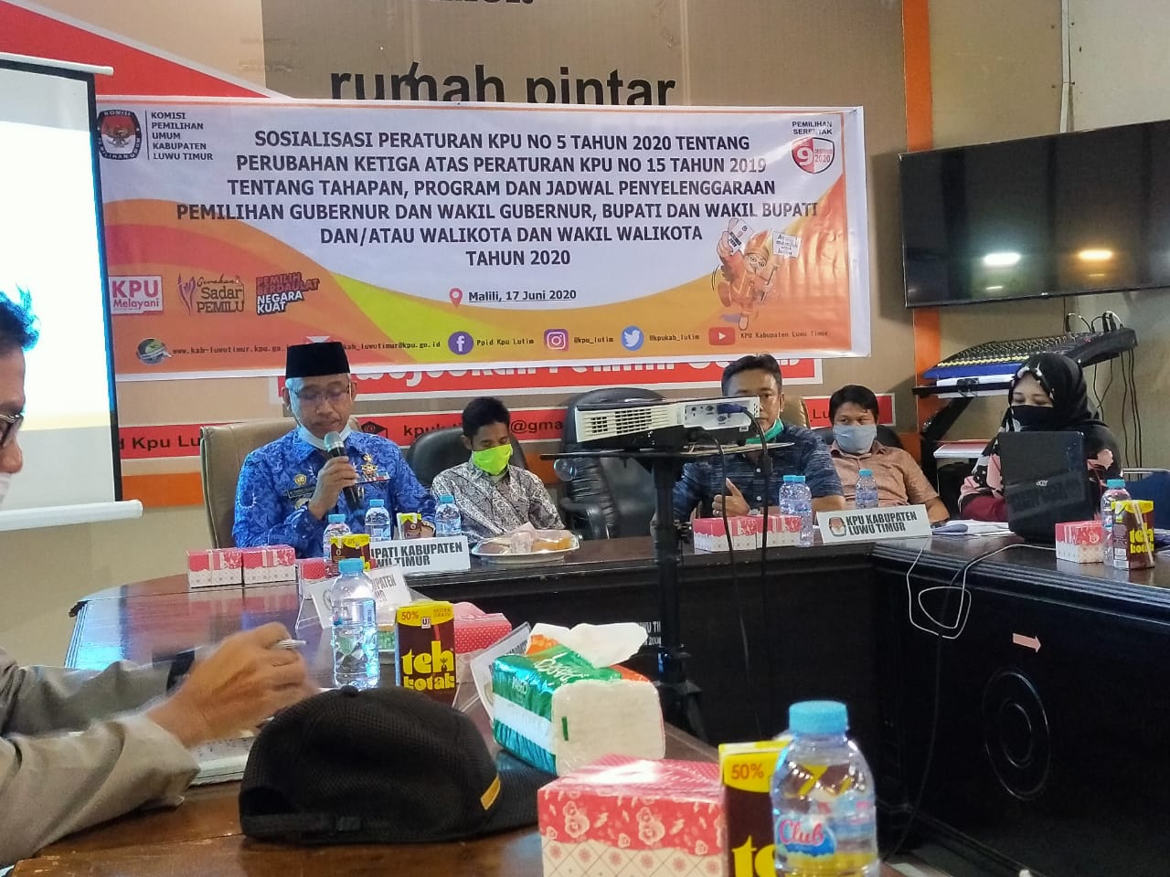 LUTIM – Bupati Luwu Timur, H. Muhammad Thoriq Husler yang juga selaku Ketua GTPP Covid-19 Kabupaten Luwu Timur menghadiri sosialisasi Peraturan Komisi Pemilihan Umum (PKPU) Nomor 5 Tahun 2020 Tentang Perubahan ketiga atas PKPU Nomor 15 Tahun 2019 tentang Tahapan, Program dan Jadwal Penyelenggaraan Pemilihan Gubernur dan Wakil Gubernur, Bupati dan Wakil Bupati atau Walikota dan Wakil Walikota yang diselenggarakan oleh KPU Kabupaten Luwu Timur bertempat di Media Centre KPU Luwu Timur, Rabu (17/06/2020).