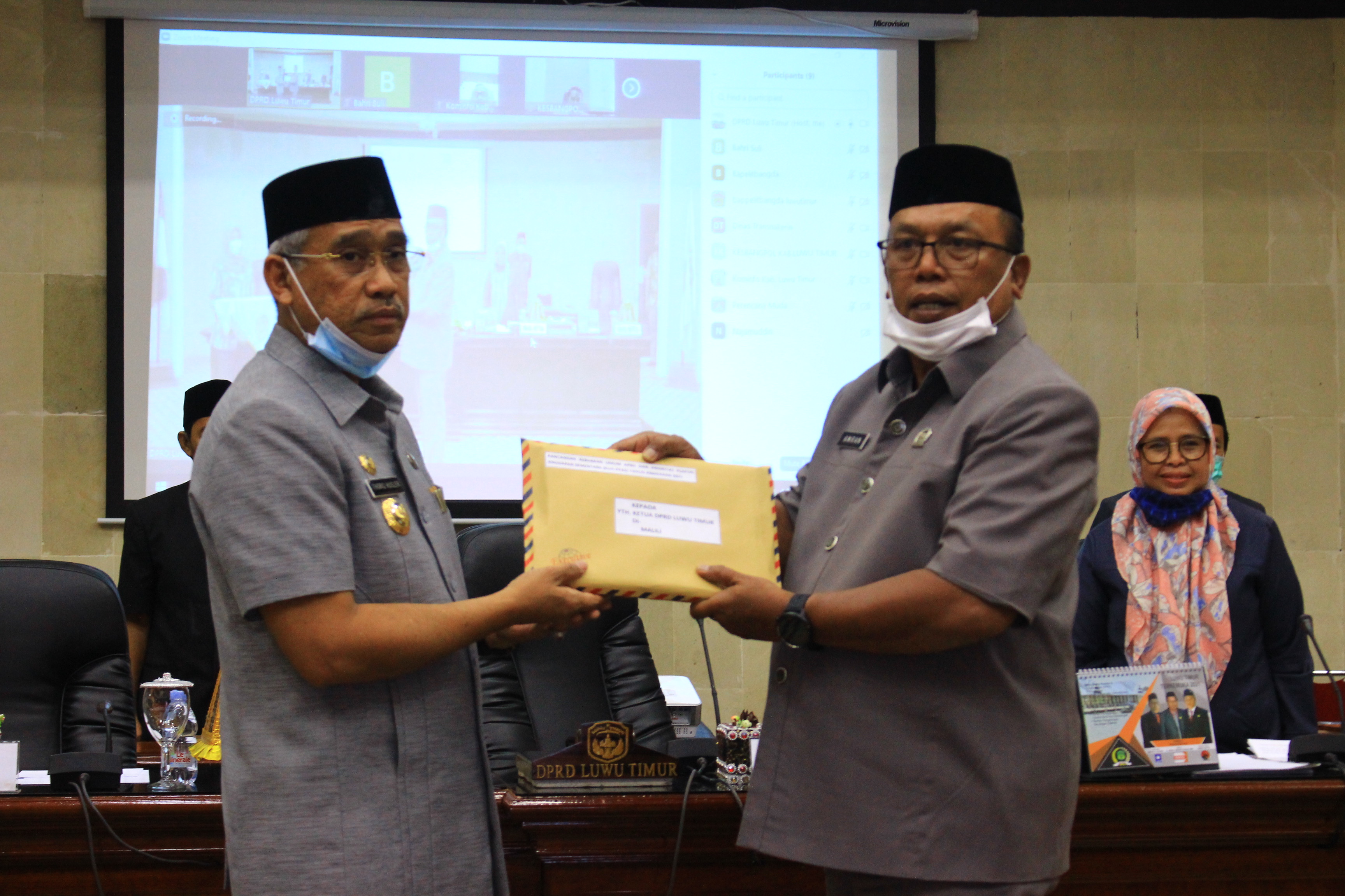LUTIM – Bupati Luwu Timur, H. Muhammad Thoriq Husler menyerahkan rancangan Kebijakan Umum Anggaran (KUA) dan Prioritas dan Plafon Anggaran Sementara (PPAS) APBD Pokok Tahun 2021 kepada Ketua DPRD, H. Amran Syam pada sidang paripurna DPRD, Kamis (30/07/2020).
