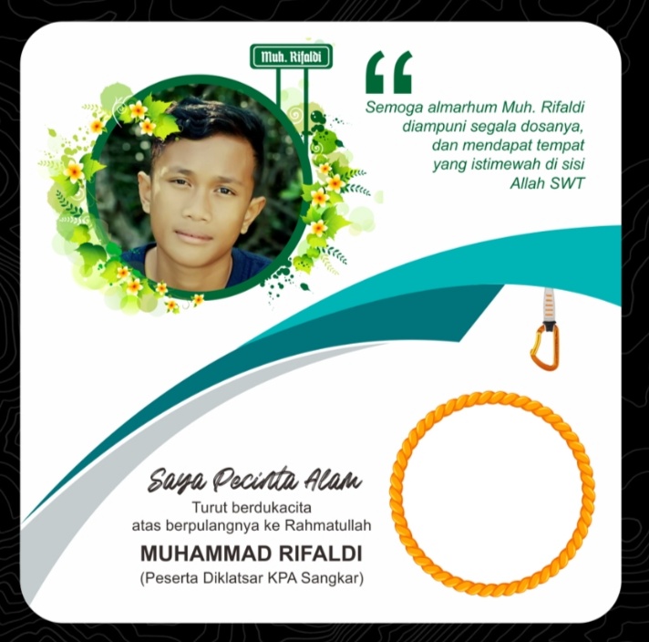 “Saya Pecinta Alam Turut berdukacita atas berpulangnya ke Rahmatullah Muhammad Rifaldi (Peserta Diklatsar KPA Sangkar)” demikian tertulis ucapan belasungkawa pada format bingkai.