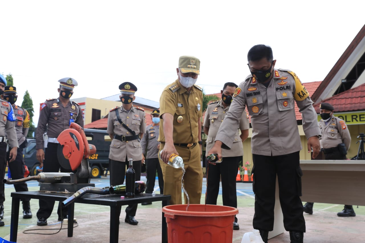 Pemusnahan barang bukti miras berbagai merk jenis bentuk dan ukuran, serta knalpot racing tersebut dipimpin Bupati Luwu Timur, H. Budiman bersama Kapolres Luwu Timur, AKBP Indratmoko S.ik.