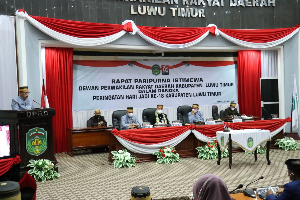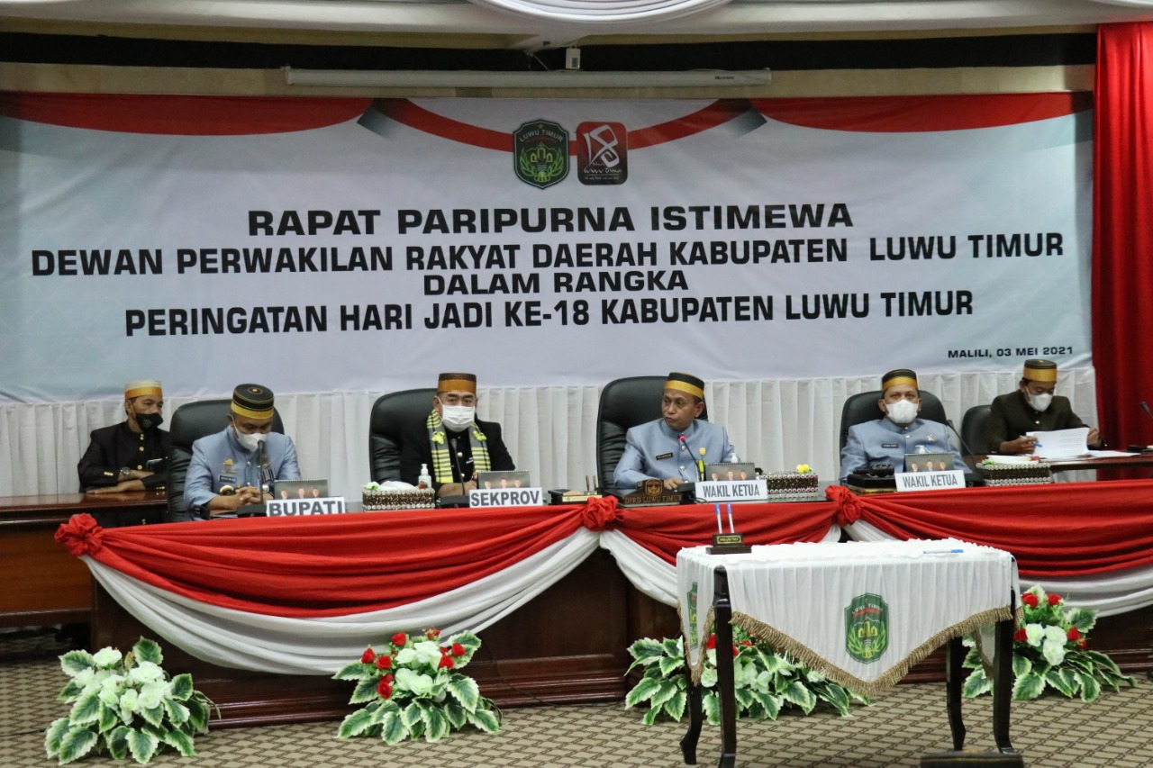 LUTIM – Dewan Perwakilan Rakyat Daerah (DPRD) Luwu Timur menggelar Rapat Paripurna dalam rangka Peringatan Hari Jadi Kabupaten Luwu Timur yang ke – 18 bertempat di Ruang Sidang Paripurna DPRD, Desa Puncak Indah, Kec. Malili, Senin (03/05/2021).