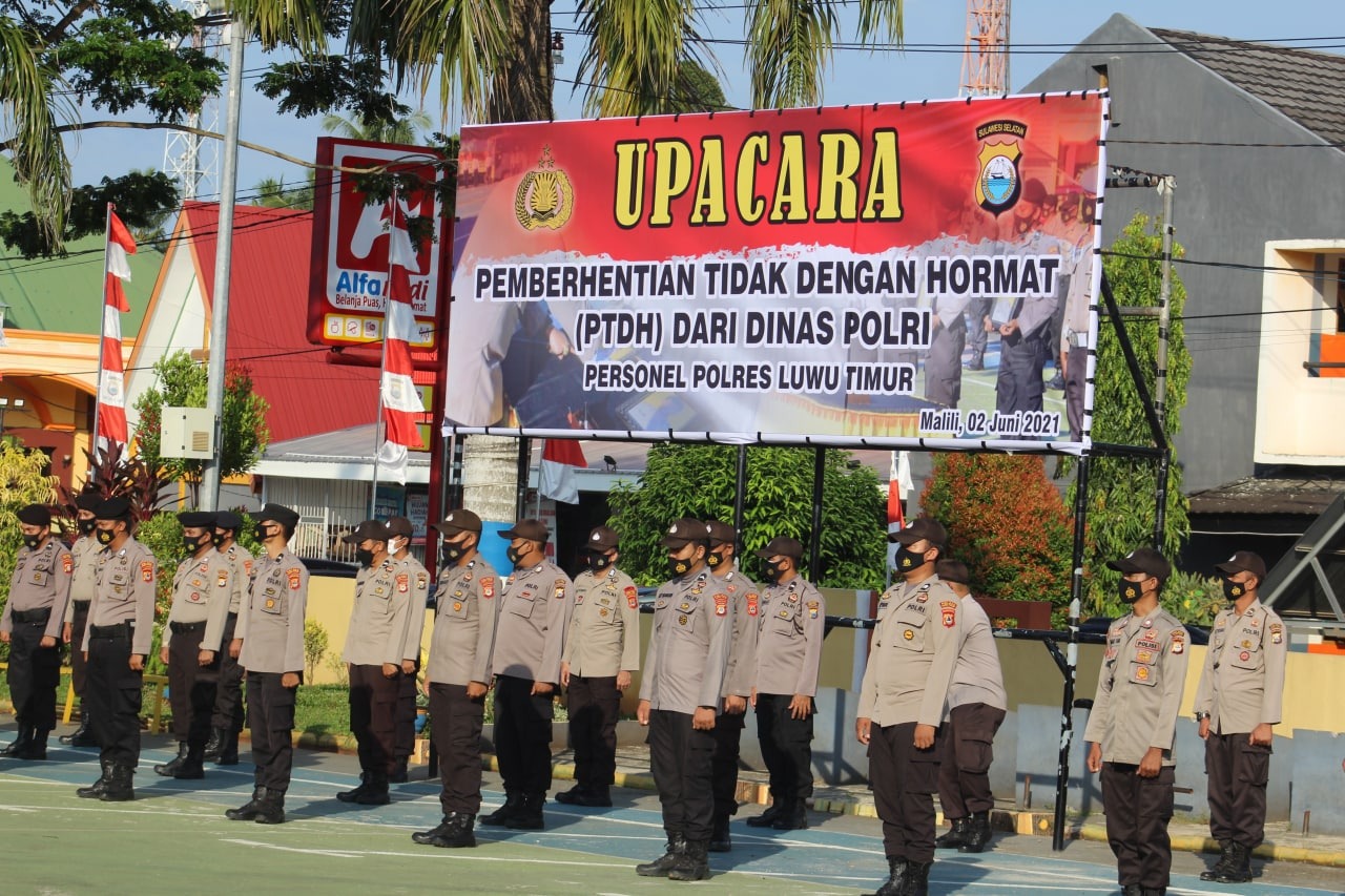 Kapolres Luwu Timur AKBP iIndratmoko S.ik pimpin upacara pemberhentian tidak dengan hormat (PTDH) personilnya dari dinas polri yang bertempat di halaman mako polres luwu timur. RABU (02/06/2021) pukul 08:00 WITA.