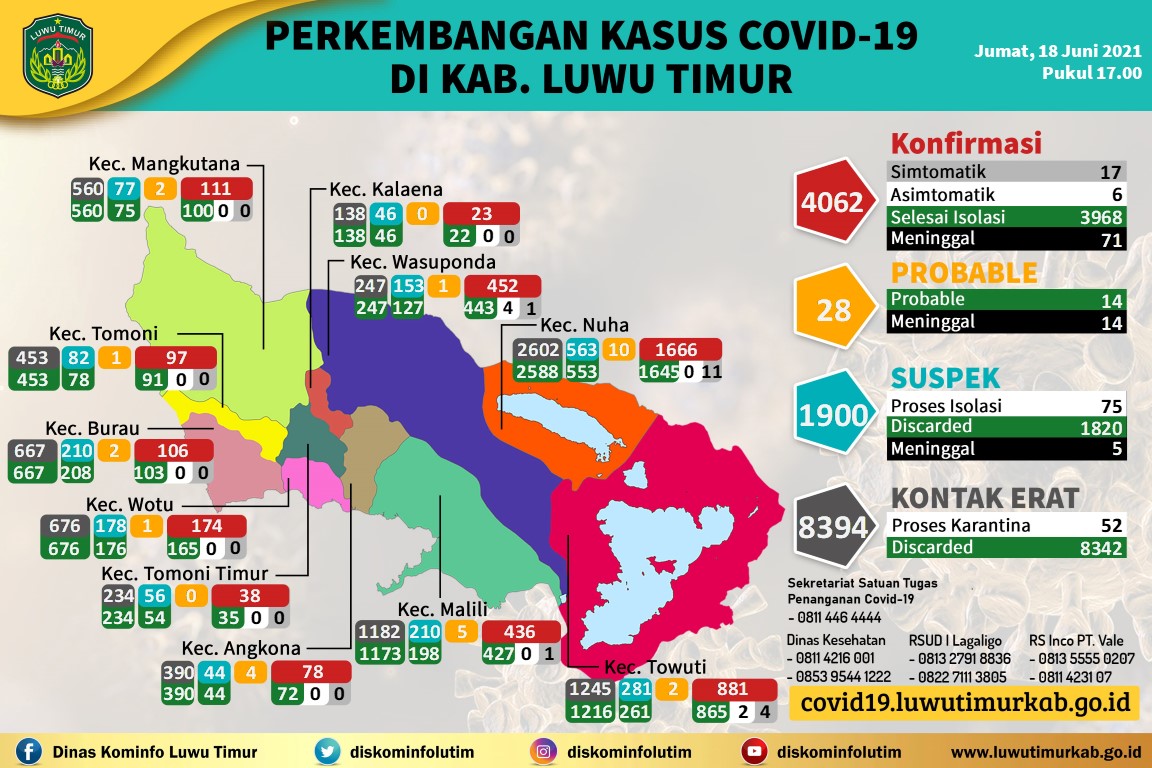 Berikut update lengkap perkembangan virus corona di Kab. Luwu Timur per tanggal 18 Juni 2021 :