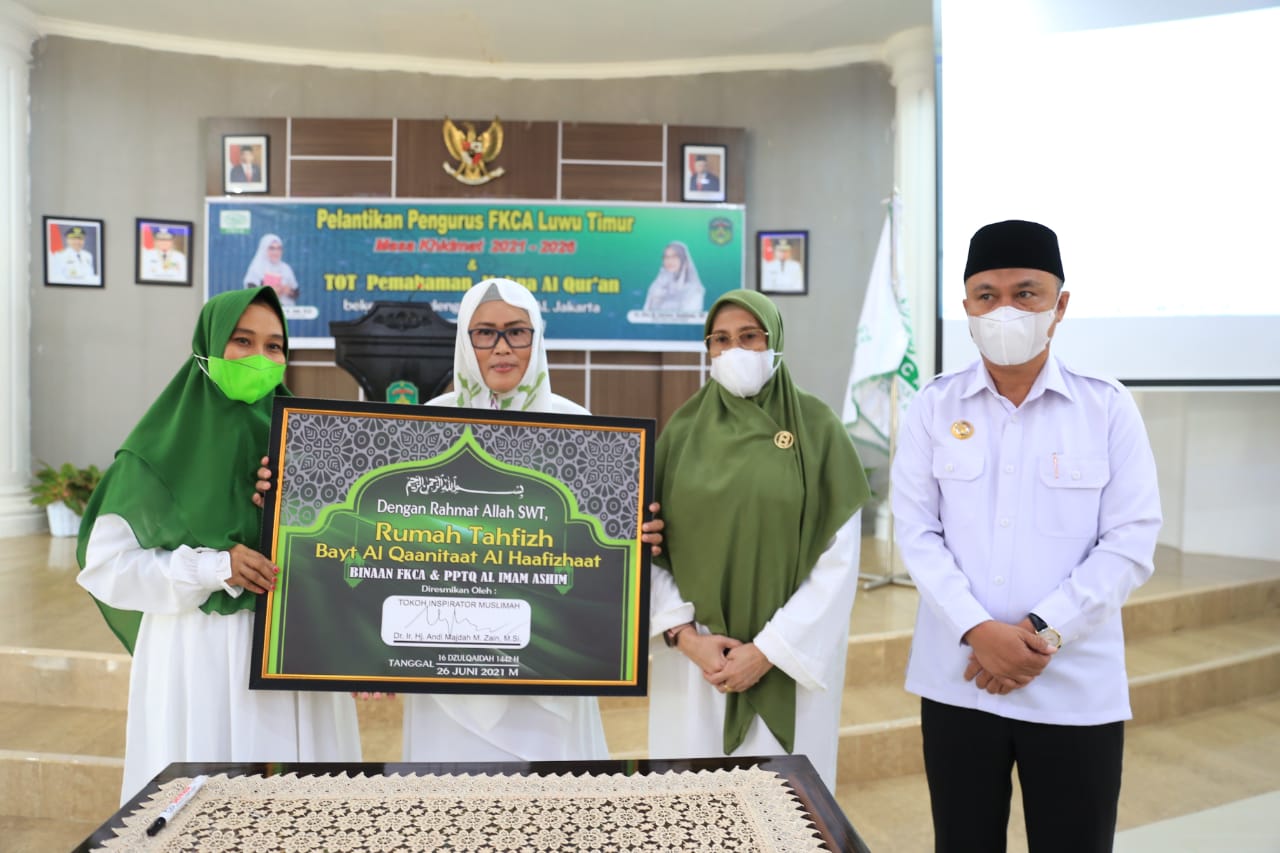 LUTIM – Pengurus Forum Kajian Cinta Alquran (FKCA) Kabupaten Luwu Timur masa Khidmat 2021-2026 resmi dilantik oleh Ketua Dewan Pembina FKCA Sulawesi Selatan, Hj. Majdah Agus Arifin Nu’mang, Jumat (25/06/2021). Pelantikan dilakukan di Aula Rumah Jabatan Bupati Luwu Timur, ditandai dengan penyerahan bendera pataka kepada Ketua FKCA Luwu Timur, Dra. Hj. Sufriyati Budiman.