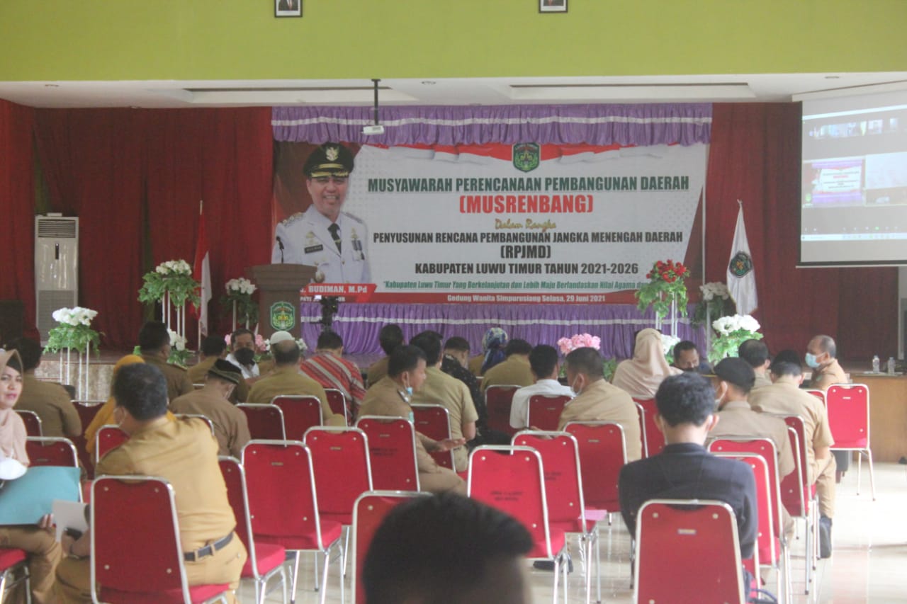 LUTIM – Sekretaris Daerah Kabupaten Luwu Timur, H. Bahri Suli, menghadiri sekaligus membuka kegiatan Musyawarah Rencana Pembangunan (Musrenbang) Rencana Pembangunan Jangka Menengah Daerah (RPJMD) Kabupaten Luwu Timur Tahun 2021-2026, di Gedung Wanita Simpurusiang, Malili, Selasa (29/06/2021).