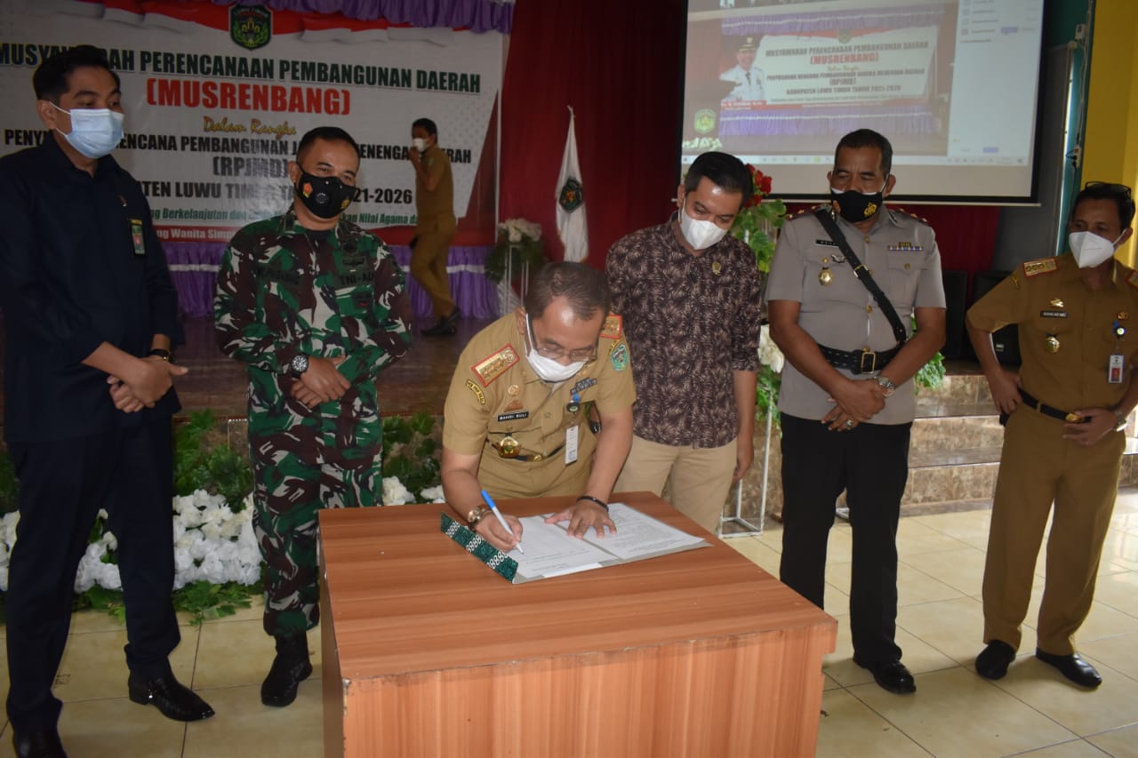 Penandatanganan bersama berita acara Musyawarah Perencanaan Pembangunan Daerah oleh Bupati Luwu Timur yang di Wakili oleh Sekertaris Daerah, H. Bahri Suli, bersama Forkompinda.