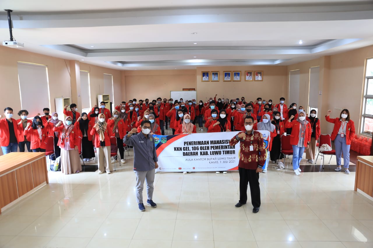 LUTIM – Sebanyak 84 orang Mahasiswa Universitas Hasanuddin melaksanakan Kuliah Kerja Nyata (KKN) Tematik Angkatan 106 di Kabupaten Luwu Timur. Rombongan Mahasiswa KKN tersebut diterima Staf Ahli Hukum dan Pemerintahan, dr. April, di Aula Sasana Praja Kantor Bupati Luwu Timur, Kamis (01/07/2021).