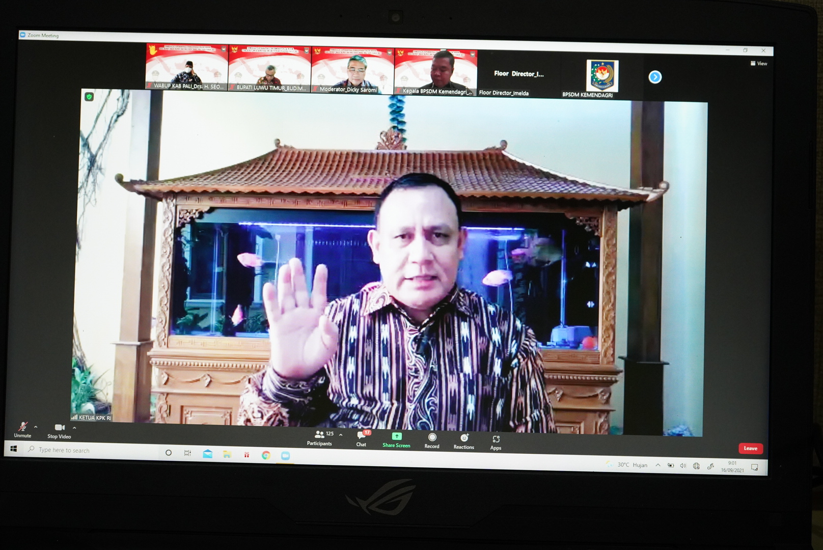 Materi pertama di pimpin Ketua KPK RI, Drs. Firli, M.Si dengan materi pencegahan dan pemberantasan korupsi. Pada materi pertama ini Bupati didampingi Sekretaris Daerah, H. Bahri Suli, Sekretaris Inspektorat, Alamsyah dan Kabag Protokol dan Komunikasi Pimpinan, Muhammad Rizki Alamsyah.