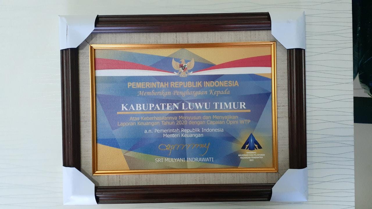 LUWU TIMUR – Menteri Keuangan, Sri Mulyani Indrawati, memberikan penghargaan kepada Kabupaten Luwu Timur atas pencapaian prestasinya memperoleh Predikat Opini Wajar Tanpa Pengecualian (WTP) minimal 5 kali berturut-turut untuk laporan Keuangan Tahun 2016 hingga 2020.