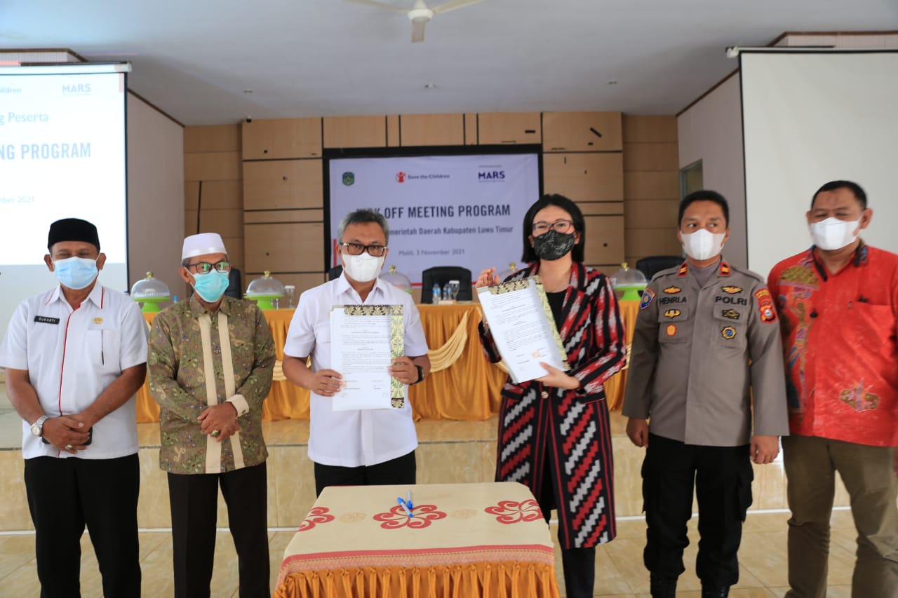 Penandatanganan ini dilakukan Bupati Luwu Timur, H. Budiman dengan Senior Manager Program and Partnership Save the Children, Aduma Situmorang disaksikan oleh Anggota DPRD Luwu Timur, KH. Suardi Ismail, Saiful Alam dari PT. Mars, Kasat Binmas, Iptu Henri Aswan yang mewakili Kapolres Luwu Timur, dan Kadis Sosial, Pemberdayaan Perempuan dan Perlindungan Anak, Sukarti.