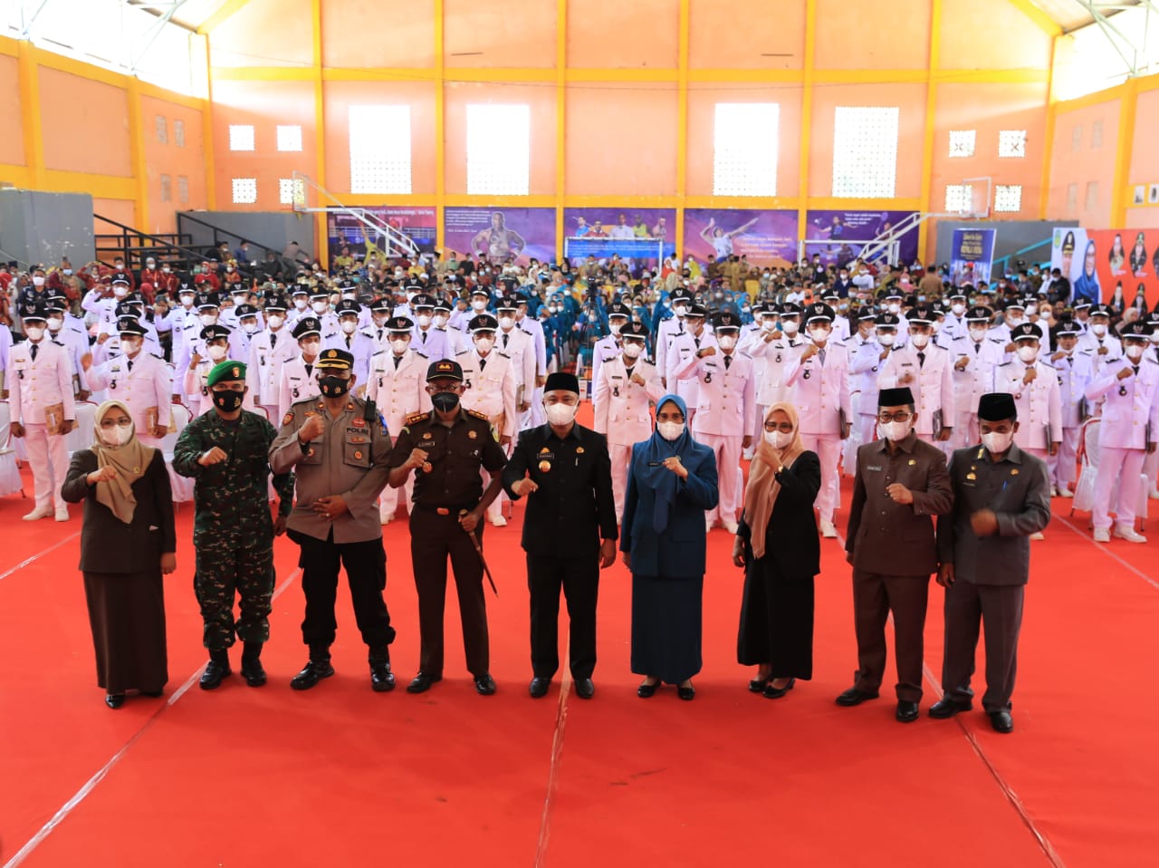 LUWU TIMUR – Bupati Luwu Timur, H. Budiman mengambil sumpah 61 Kepala Desa Terpilih hasil Pilkdes serentak, di Gedung Olahraga (GOR) Malili, Kamis (18/11/2021). Acara tersebut dihadiri oleh Kejari Luwu Timur, Wakapolres Luwu Timur, Perwira Penghubung, Anggota DPRD Kabupaten Luwu Timur, Sekertaris Daerah, Ketua TP PKK Luwu Timur, Kepala OPD, Camat se-kabupaten Luwu Timur dan Kepala Desa Terpilih.