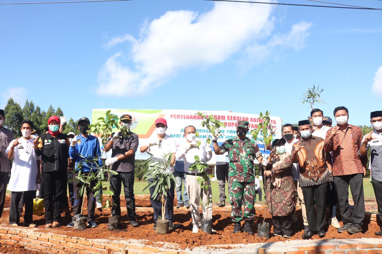 LUWU TIMUR – Bupati Luwu Timur, H. Budiman bersama unsur Forkopimda mengapresiasi gerakan Peduli Berbudaya Lingkungan Hidup di Sekolah (PBLHS) menuju Sekolah Adiwiyata dan Hari Menanam Pohon Indonesia yang digelar di Lapangan Merdeka Puncak Indah Malili, Jumat (26/11/2021).