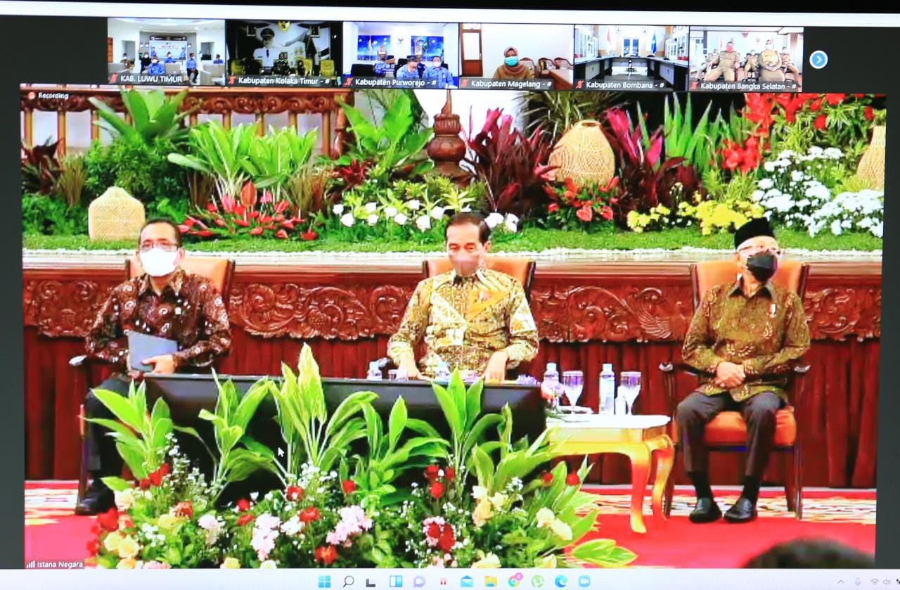 LUWU TIMUR – Bupati Luwu Timur, H. Budiman didampingi Sekretaris Daerah Kabupaten Luwu Timur, H. Bahri Suli bersama jajaran Pemerintah Kabupaten Luwu Timur, menghadiri penyerahan Daftar Isian Pelaksanaan Anggaran (DIPA) dan Daftar Alokasi Transfer ke Daerah dan Dana Desa (TKDD) Tahun 2022 oleh Presiden Republik Indonesia, Joko Widodo, secara virtual di Aula Rumah Jabatan Bupati Luwu Timur, Senin (29/11/2021).