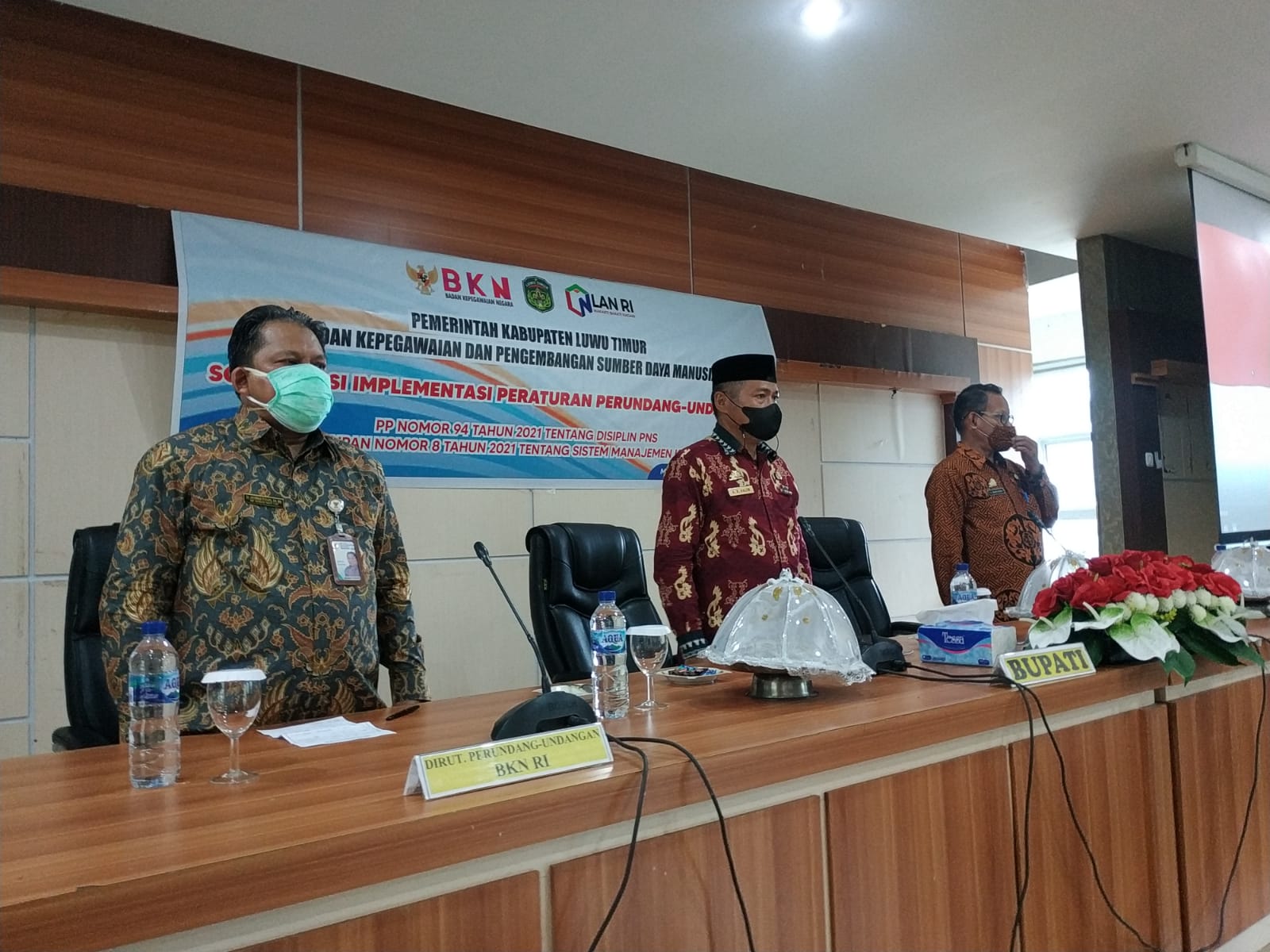 LUWU TIMUR – Pemerintah Kabupaten Luwu Timur melalui Badan Kepegawaian dan Pengembangan Sumber Daya Manusia (BKPSDM) bekerjasama dengan Badan Kepegawaian Negara (BKN) dan Puslatbang KMP LAN RI Makassar melakukan sosialisasi implementasi peraturan Perundang-Undangan yang berlangsug di Aula Sasana Praja Kantor Bupati Luwu Timur, Kamis (16/12/2021).