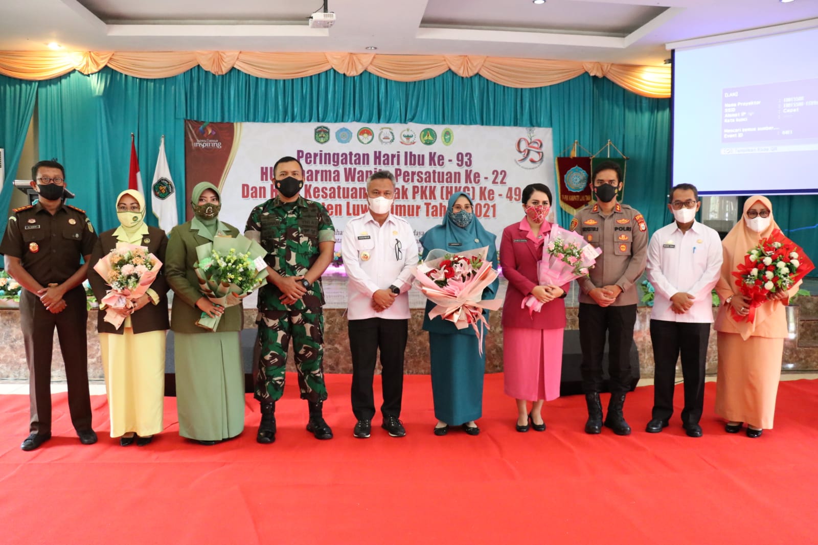 LUWU TIMUR – Puncak peringatan Hari Ibu ke 93 dirangkaikan dengan HUT Dharma Wanita Persatuan (DWP) ke-22 dan Hari Kesatuan Gerak PKK (HKG) ke-49 tingkat Kabupaten Luwu Timur yang diselenggarakan di Gedung Wanita Simpurusiang, Desa Puncak Indah, Kecamatan Malili, Rabu (22/12/2021).