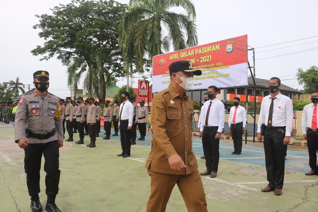 LUWU TIMUR – Bupati Luwu Timur, H. Budiman menjadi Inspektur Upacara saat Apel Gelar Pasukan Operasi Lilin-2021 di Halaman Polres Lutim, Kamis (23/12/2021). Bupati mengatakan, ini bukan apel rutin tahunan biasa. Apel ini merupakan pengecekan akhir persiapan pasukan dan misi pengamanan Natal dan Tahun Baru. Sebab pada momen tersebut di pastikan ada peningkatan aktivitas masyarakat di tempat keramaian.