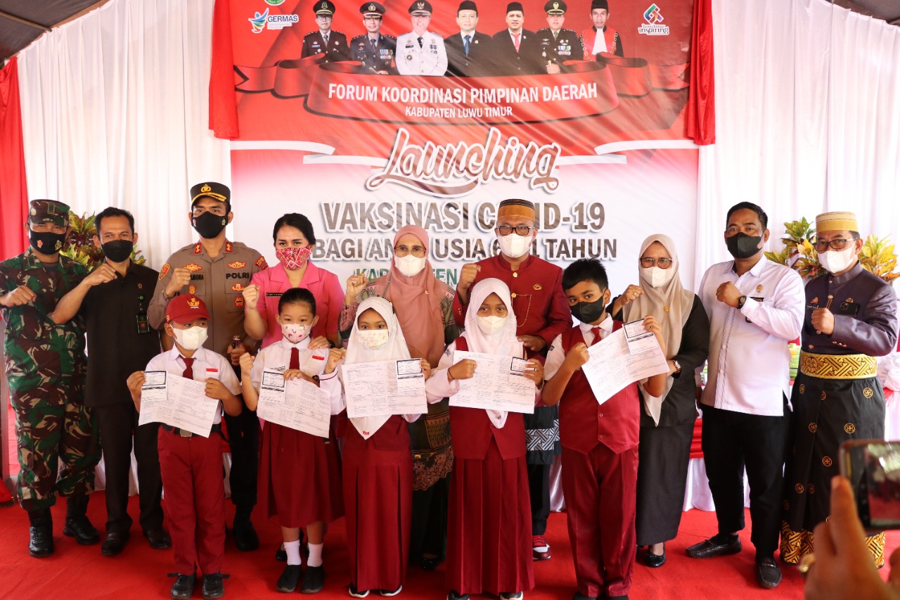 LUWU TIMUR – Bupati Luwu Timur, H. Budiman secara resmi melaunching program Vaksinasi covid-19 untuk anak usia 6-11 tahun se-Kabupaten Luwu Timur yang berlangsung di SDN 221 Batu Merah, Kelurahan Malili, Kecamatan Malili, Senin (10/01/2022).