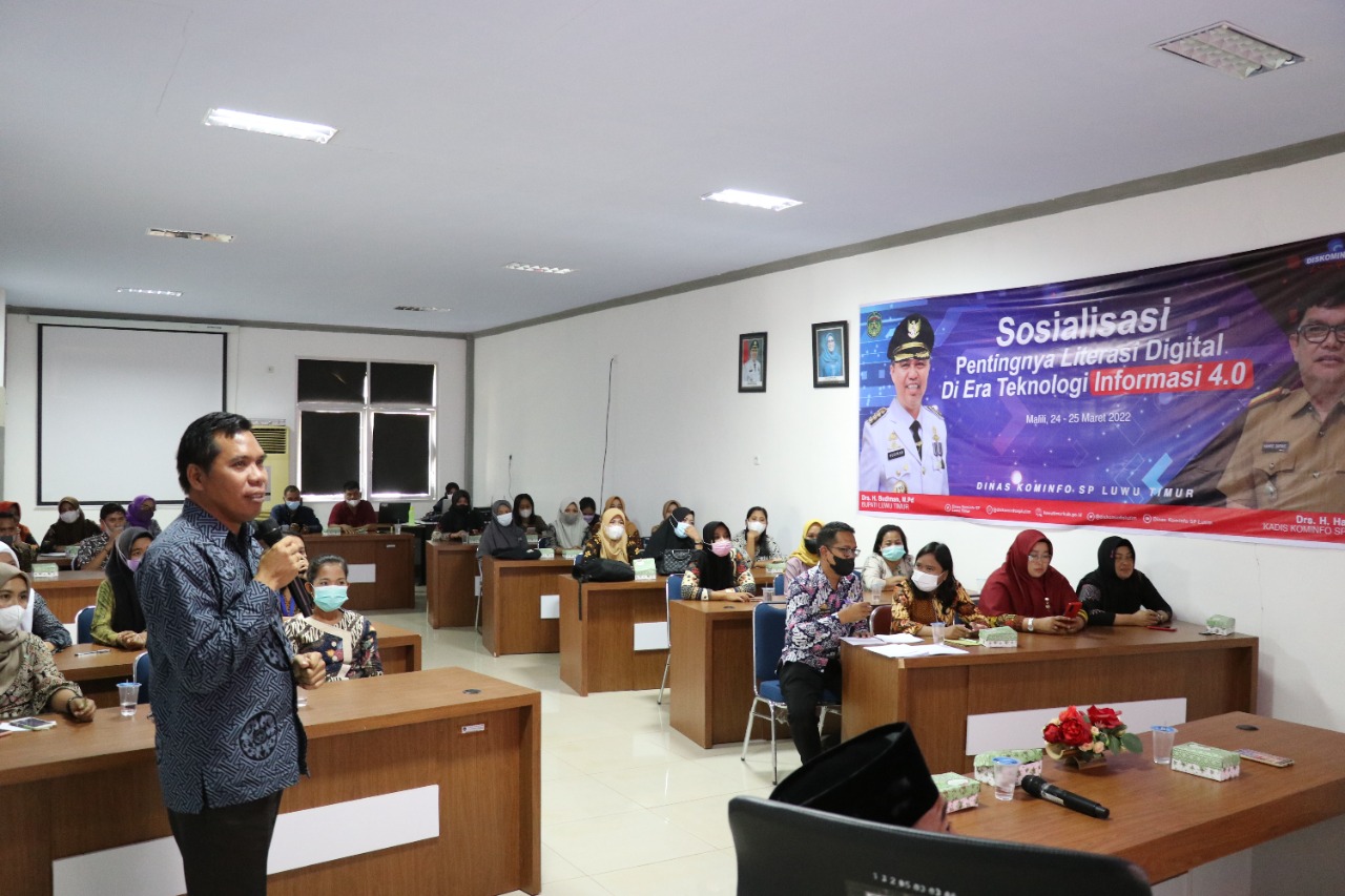 LUWU TIMUR – Guna memberikan pengetahuan tentang Pentingnya Literasi Digital di Era Teknologi Informasi 4.0, khususnya bagi pengelola Perpustakaan Desa se-Kabupaten Lutim, maka Dinas Komunikasi, Informatika, Statsitik dan Persandian (Diskominfo-SP) Kabupaten Luwu Timur (Lutim) melalui Bidang Informasi Komunikasi Publik dan Hubungan Masyarakat (IKP dan Humas) menggelar Sosialisasi Pentingnya Literasi Digital di Era Teknologi Informasi 4.0, Kamis (24/03/2022).