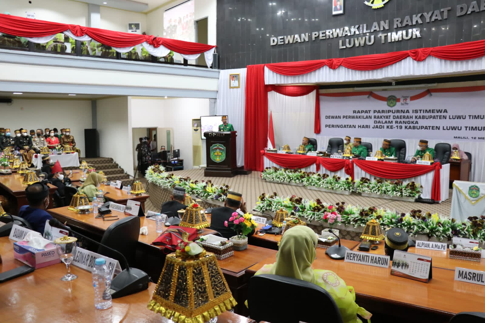 LUWU TIMUR – Kabupaten Luwu Timur, Bumi Batara Guru Genap berusia 19 Tahun pada tanggal 03 Mei 2022 Lalu, namun puncak peringatan hari bersejarah kabupaten paling timur Sulawesi Selatan itu baru diperingati pada kamis (12/05/2022) dalam Sidang Paripurna Istimewa DPRD Lutim dalam rangka Hari Jadi Luwu Timur yang dipimpin langsung oleh Ketua DPRD Luwu Timur, Aripin, S.Ag. didampingi Wakil Ketua Muh. Siddik, BM. dan H. Usman Sadik.