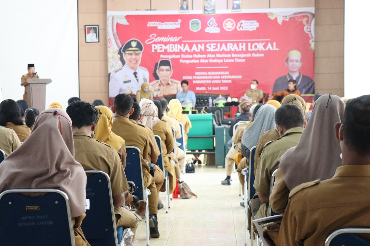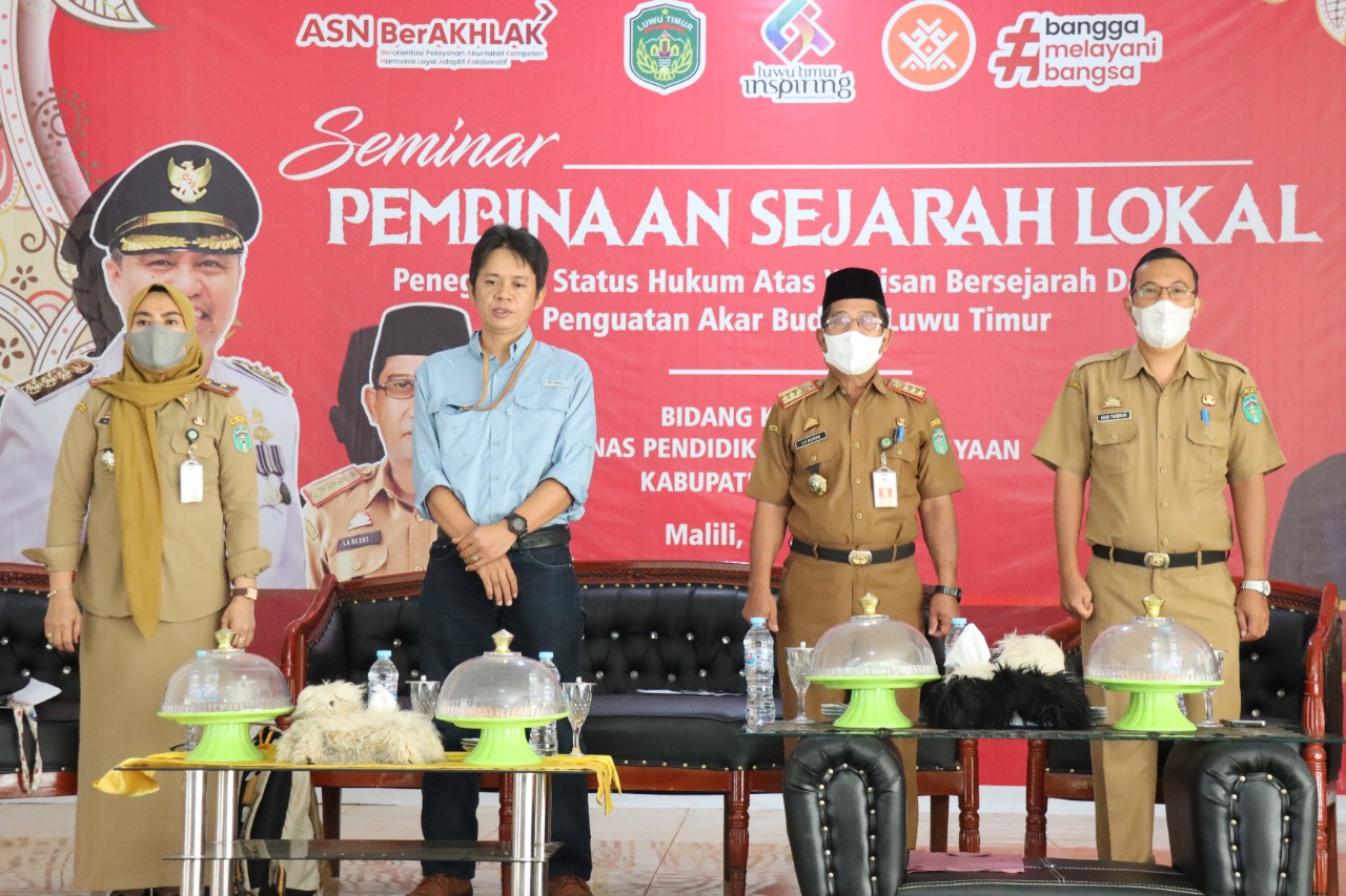 LUWU TIMUR – Kepala Dinas Pendidikan dan Kebudayaan (Disdikbud) Kabupaten Lutim, La Besse mewakili Bupati Luwu Timur didampingi Kabid Kebudayaan, Zulhidayah, Pamong Budaya Ahli Muda, Iswadi, Sekdis Parmudora, Agus Thobarani, serta Macoa Bawalipu, Bau Muh. Aras Abdi To Baji Pua Sinri, membuka Seminar Pembinaan Sejarah Lokal dengan tema “Penegakan Status Hukum Atas Warisan Bersejarah Dalam Penguatan Akar Lutim” yang diselenggarakan oleh Disdikbud di Aula Kantor Disdikbud, Selasa (14/06/2022).
