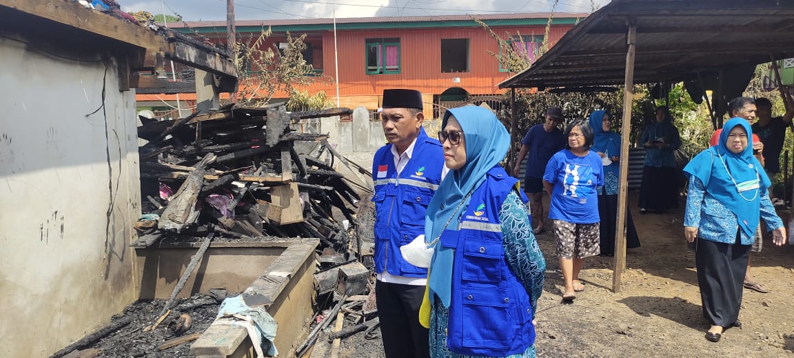 LUWU TIMUR – Ketua Tim Penggerak (TP) Pemberdayaan Kesejahteraan Keluarga (PKK) Kabupaten Luwu Timur (Lutim), Hj. Sufriaty bersama Kepala Dinas Sosial Pemberdayaan Perempuan dan Perlindungan Anak (Dinsos P3A), Sukarti, menyambangi sekaligus memberikan dukungan moril kepada korban kebakaran di Jl. Krakatau, F. 296 RT 10 Lingkungan Lawewu Sorowako, Kelurahan Magani, Kecamatan Nuha, Rabu (15/06/2022).