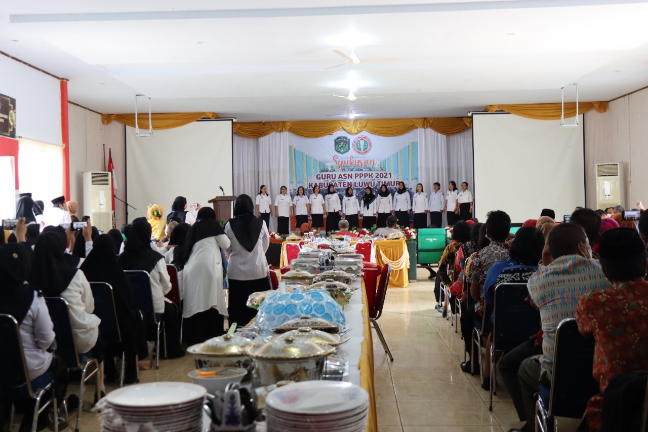 LUWU TIMUR – Bupati Luwu Timur (Lutim), H. Budiman didampingi Ketua Tim Penggerak PKK, Hj. Sufriaty, Kepala Dinas Pendidikan dan Kebudayaan, La Besse, Ketua Dewan Pendidikan, H. Ardias Bara, Asisten Perekonomian dan Pembangunan, Masdin, Asisten Administrasi Umum, Nursih Hariani, Staf Ahli Pembangunan, Rapiuddin, Forum Koordinasi Pimpinan Daerah Lutim (Forkopimda), menghadiri acara syukuran guru ASN PPPK Tahun 2021 Kabupaten Luwu tTimur di Aula Disdikbud, Kamis (23/06/2022).