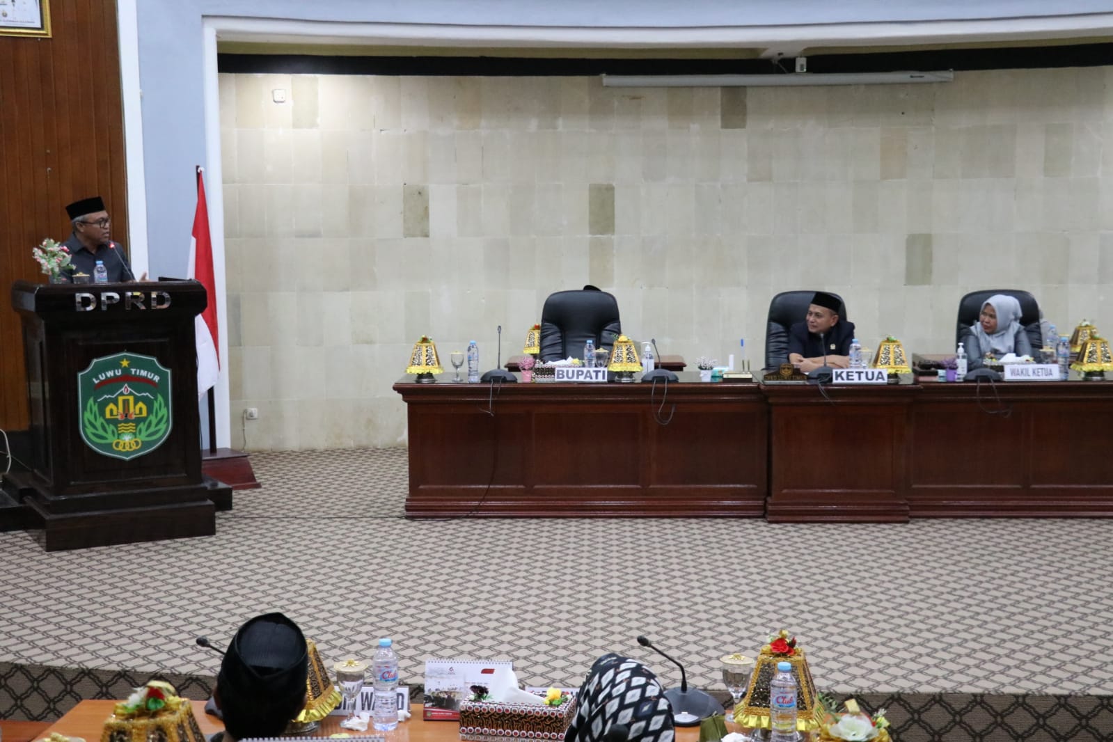 Paripurna dipimpin Wakil Ketua I DPRD Lutim, H. Muhammad Siddiq BM. didampingi Ketua Komisi I, Hj. Harisah Suharjo serta dihadiri segenap Anggota DPRD Lutim dan Kepala OPD Lingkup Pemkab Luwu Timur.