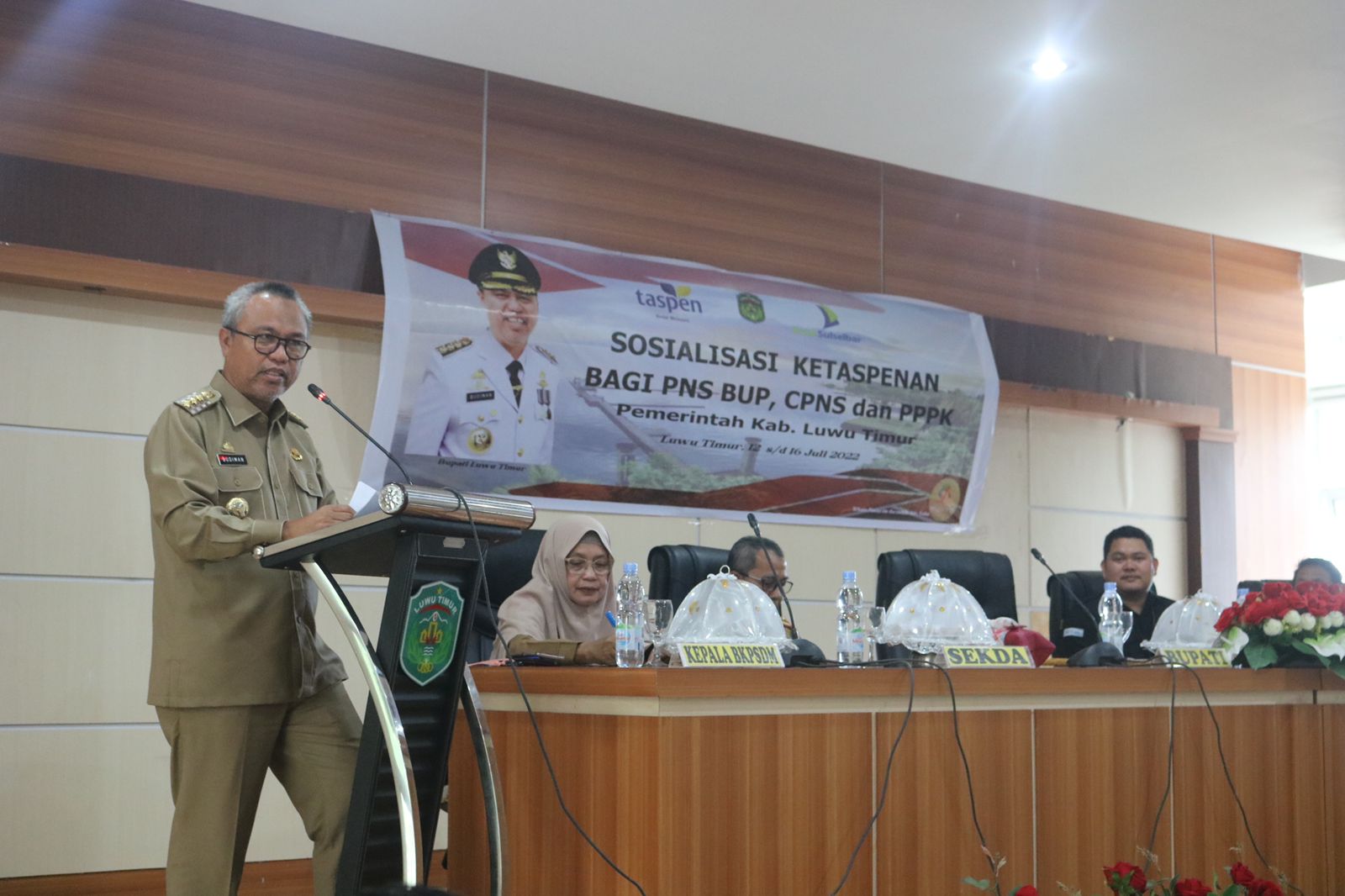 LUWU TIMUR – Bupati Luwu Timur, H. Budiman membuka Sosialisasi Ketaspenan Bagi BUP, CPNS dan PPK yang di rangkaikan dengan penyerahan SK Pensiun di Aula Sasana Praja kantor Bupati Luwu Timur, Selasa (12/07/2022).