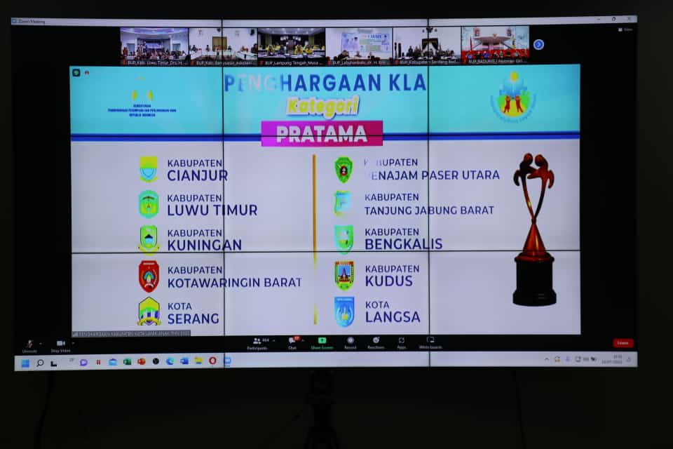 Penyerahan penghargaan KLA 2022 dipimpin Menteri PPPA, Bintang Puspayoga yang diikuti oleh para Gubernur, Walikota dan Bupati seluruh Indonesia.
