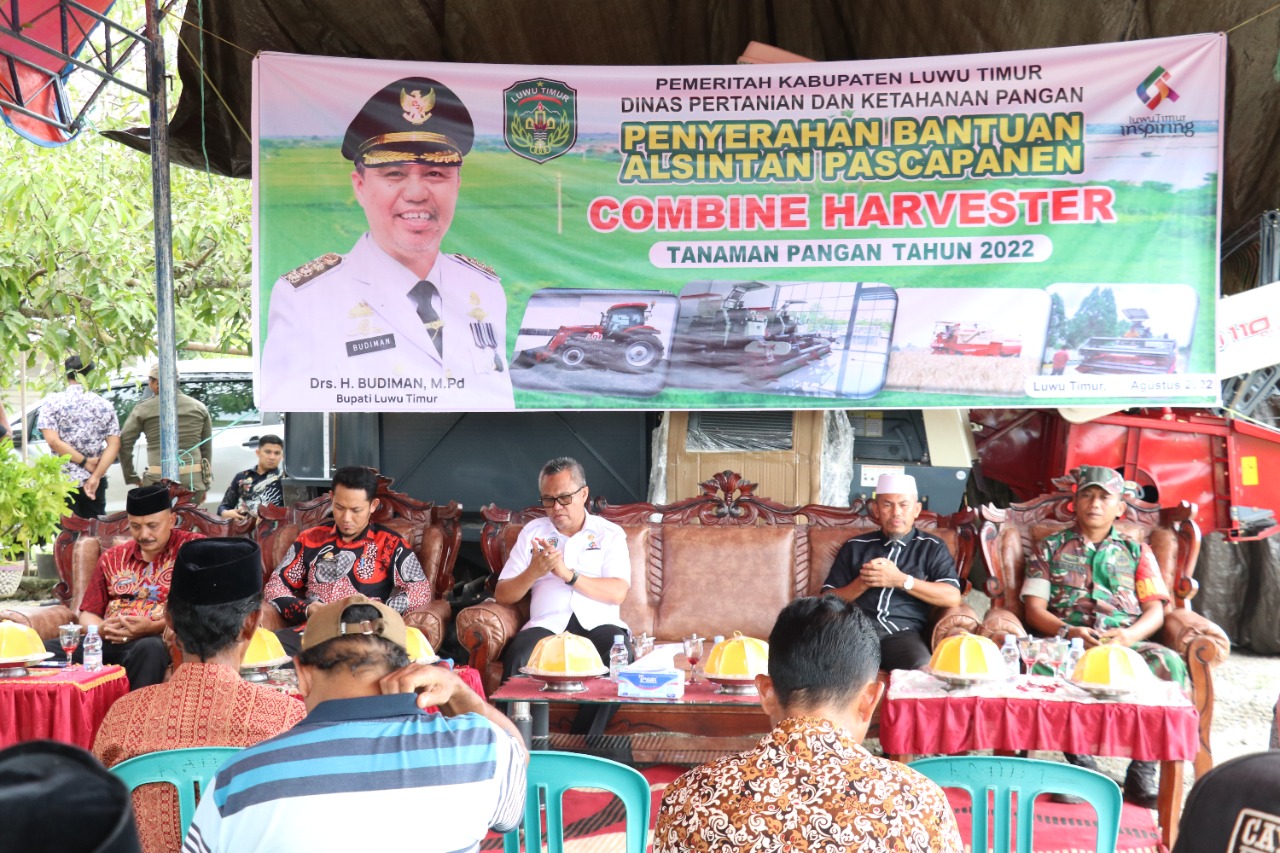LUWU TIMUR – Bupati Luwu Timur, H. Budiman menyerahkan langsung bantuan alat mesin pertanian (alsintan) pasca panen Combine Harvester kepada kelompok tani (Poktan) Darma Karya II, di Desa Sumber Agung, Kecamatan Kalaena, Kamis (04/08/2022).