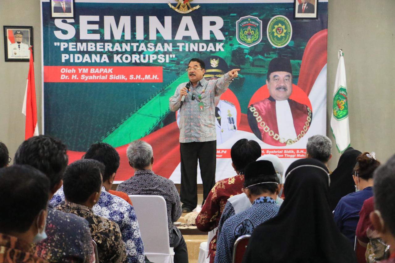 LUWU TIMUR – Bupati Luwu Timur, H. Budiman bersama para Asisten, Staf Ahli, Kepala OPD, Direktur RSUD I Lagaligo, Camat, dan Kepala PKM mengikuti Seminar Pemberantasan Tindak Pidana Korupsi dengan narasumber Ketua Pengadilan Tinggi Makassar, Dr. H. Syahrial Sidik, SH. MH., bertempat di Aula Rumah Jabatan Bupati, Kamis (08/09/2022).